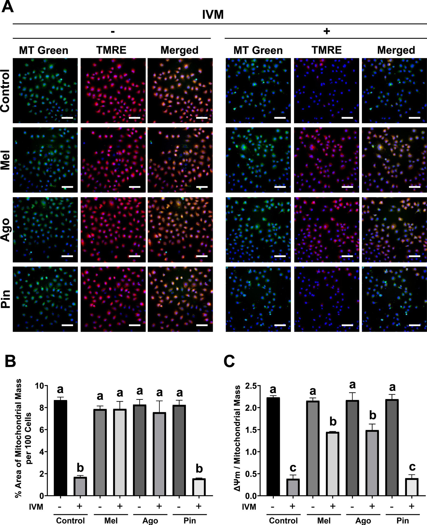 Melatonin’s and agomelatine’s recovery of ΔΨm and mitochondrial mass in GC-1 spermatogonia (spg) treated with 16 μM ivermectin (IVM) for 3 h (A) Fluorescence microscopy images of GC-1 spg stained with tetramethylrhodamine ethyl ester (TMRE) and/or MitoTracker and Hoechst 33,342. (B) Semi-quantification of MitoTracker fluorescence intensity (n = 5), and (C) ratio of TMRE to MitoTracker fluorescence intensity in GC-1 spg treated with either control, melatonin, agomelatine, or pinoline with or without 16 μM IVM (n = 5). Scale bars: 100 µm. IVM treatment conditions are denoted as positive (+) or negative (−). Data are shown as means ± SEM. Significant differences are denoted by different letters (a–c) at p < 0.05. Mel, melatonin; Ago, agomelatine; Pin, pinoline