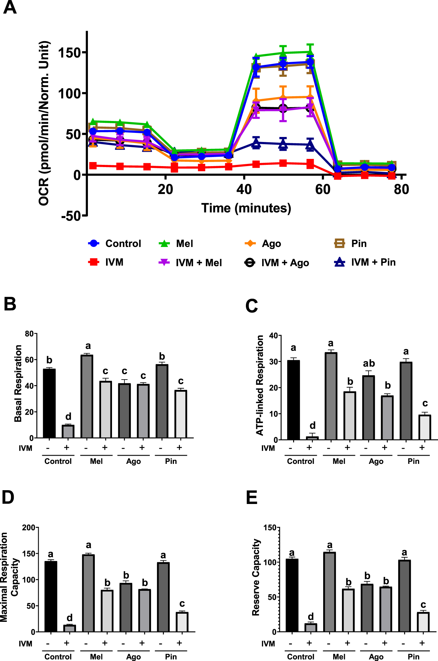 Seahorse assay of GC-1 spermatogonia (spg) treated with or without melatonin analogs and/or ivermectin (IVM) for 3 h (A) Oxygen consumption rate (OCR) plot following sequential injections of oligomycin, FCCP (carbonyl cyanide-p-trifluoromethoxyphenylhydrazone), and rotenone/antimycin A (R/AA). (B) Basal respiration, (C) ATP-linked respiration, (D) maximal respiration capacity, and (E) reserve capacity calculated from OCR data (n = 3). Data are presented as means ± SEM. Significant differences are indicated by different letters (a–d) at p < 0.05. Mel, melatonin; Ago, agomelatine; Pin, pinoline.