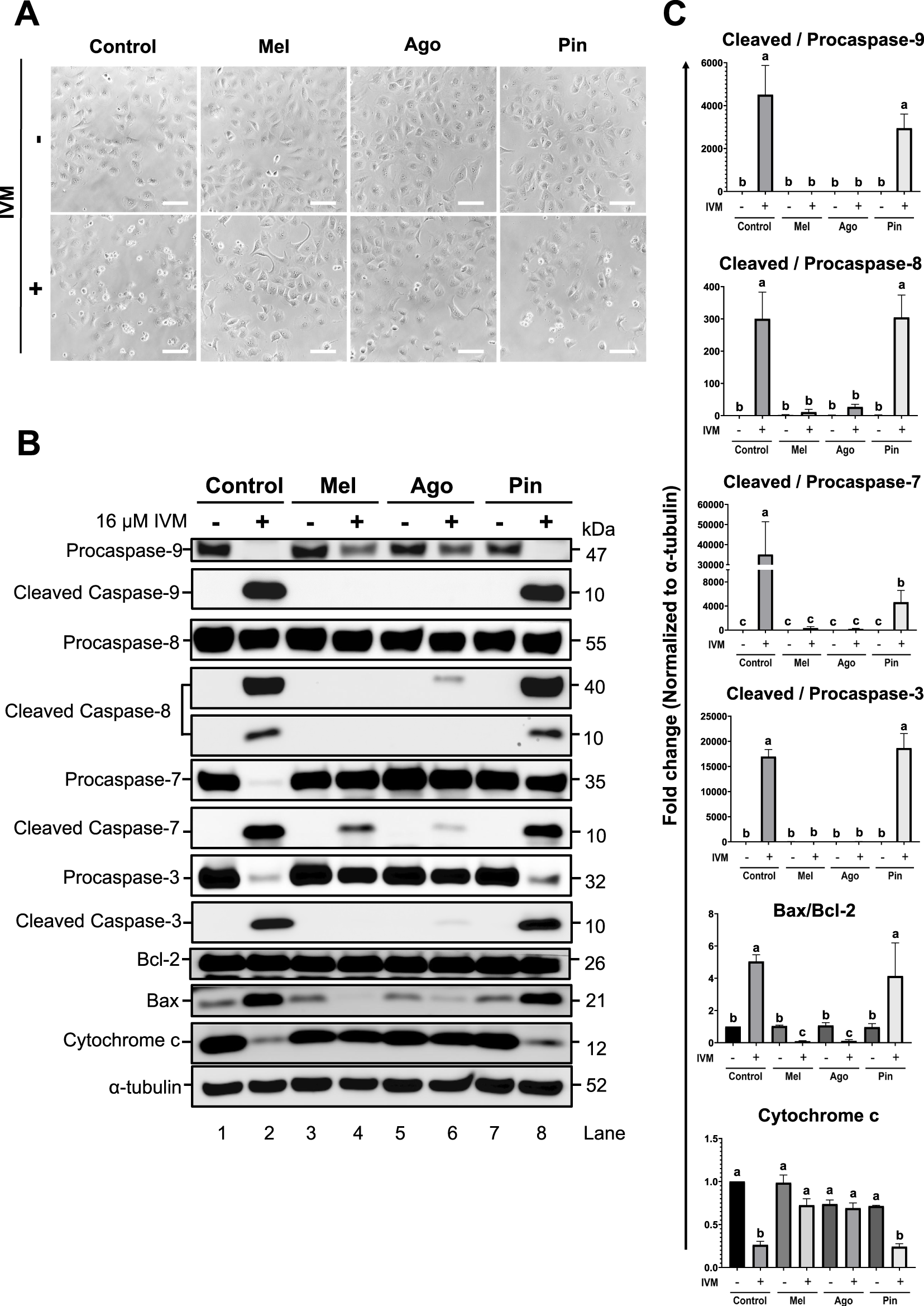 Attenuation of apoptosis by melatonin and agomelatine in GC-1 spermatogonia (spg) treated with ivermectin (IVM) for 3 h (A) Brightfield microscopy images showing morphological changes in GC-1 spg following treatment with IVM and/or melatonin analogs. Scale bars: 100 µm. (B) Western blot analysis of apoptosis-related proteins, including cleaved caspases, BCL-2, BAX, Cytochrome c, and α-tubulin (used as a loading control), under the indicated treatment conditions. Mel, melatonin; Ago, agomelatine; Pin, pinoline (C) Quantification of apoptosis-related proteins (n = 3). Data are shown as means ± SEM. Significant differences are denoted by different letters (a–c) at p < 0.05. Mel, melatonin; Ago, agomelatine; Pin, pinoline.