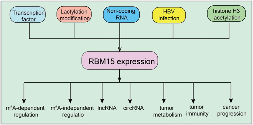 Figure 1. Regulation of RBM15 expression and its downstream effects. Multiple upstream factors, including transcription factors, lactylation modification, non-coding RNAs, HBV infection, and histone H3 acetylation, regulate RBM15 expression. RBM15 in turn influences diverse cellular processes through both m6A-dependent and m6A-independent regulation, affecting lncRNAs, circRNAs, tumor metabolism, tumor immunity, and cancer progression.