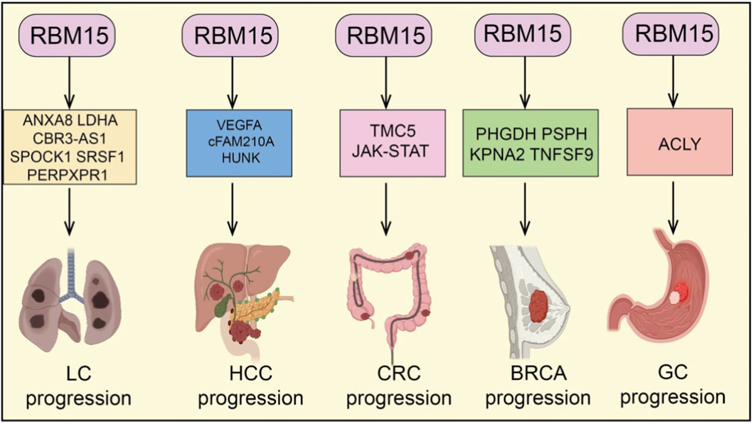 Taken together, RBM15 serves as a crucial link between epitranscriptomic regulation and cancer biology, exerting multilayered functions through diverse mechanisms. Previous reviews on RBM15 have primarily focused on its roles in cancer biology, with limited discussion of its functions in the immune system. In contrast, this review aims to systematically summarize recent advances regarding the roles of RBM15 in cancer progression and tumor immunity, with a particular emphasis on its m6A-mediated molecular mechanisms and potential clinical applications. We hope to provide new perspectives for understanding the mechanistic basis of RBM15 in tumorigenesis and progression, and to establish a theoretical foundation for its development as both a prognostic biomarker and a therapeutic target.