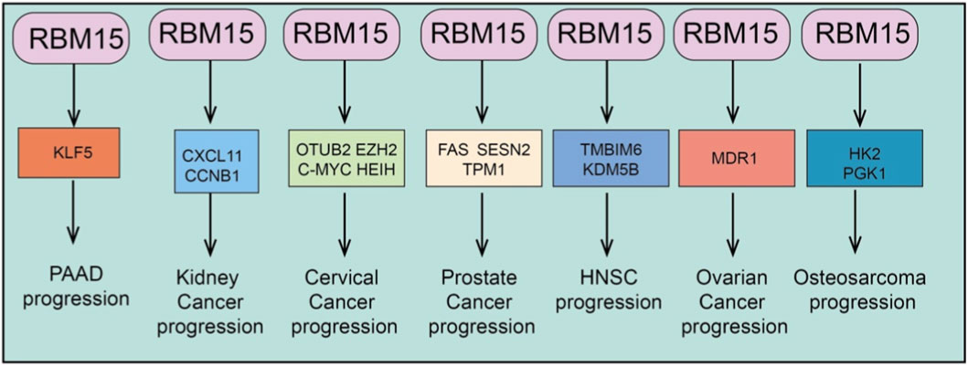 Figure 3. Broad oncogenic functions of RBM15 across cancer types. RBM15 promotes tumor progression by regulating distinct targets across multiple cancers: PAAD (pancreatic adenocarcinoma) via KLF5; Kidney cancer via CXCL11 and CCNB1; Cervical cancer via OTUB2, EZH2, c-MYC, and HEIH; Prostate cancer via FAS, SESN2, and TPM1; HNSC (head and neck squamous carcinoma) via TMBIM6 and KDM5B; Ovarian cancer via MDR1; and Osteosarcoma via HK2 and PGK1.