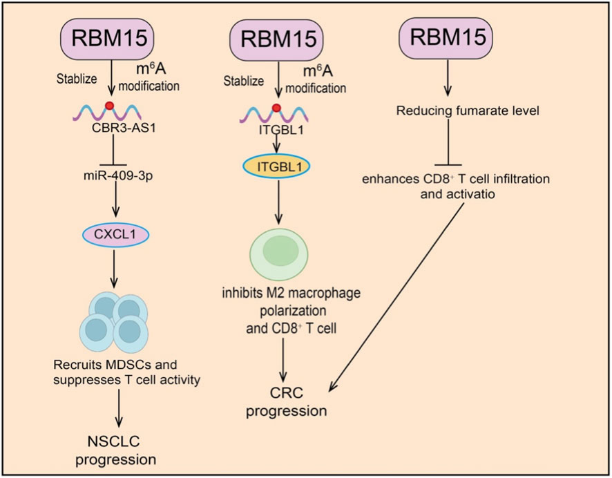Figure 4. Functional roles of RBM15 in tumor immunity and progression. RBM15 stabilizes and promotes m6A modification of target RNAs. (Left) RBM15 stabilizes CBR3-AS1, leading to suppression of miR-409–3p and upregulation of CXCL1, which recruits MDSCs and suppresses T cell activity, thereby promoting NSCLC progression. (Middle) RBM15 stabilizes ITGBL1, suppressing M2 macrophage polarization and CD8+ T cell responses, contributing to CRC progression. (Right) RBM15 reduces fumarate levels, enhancing CD8+ T cell infiltration and activation, which modulates immune responses in CRC.
