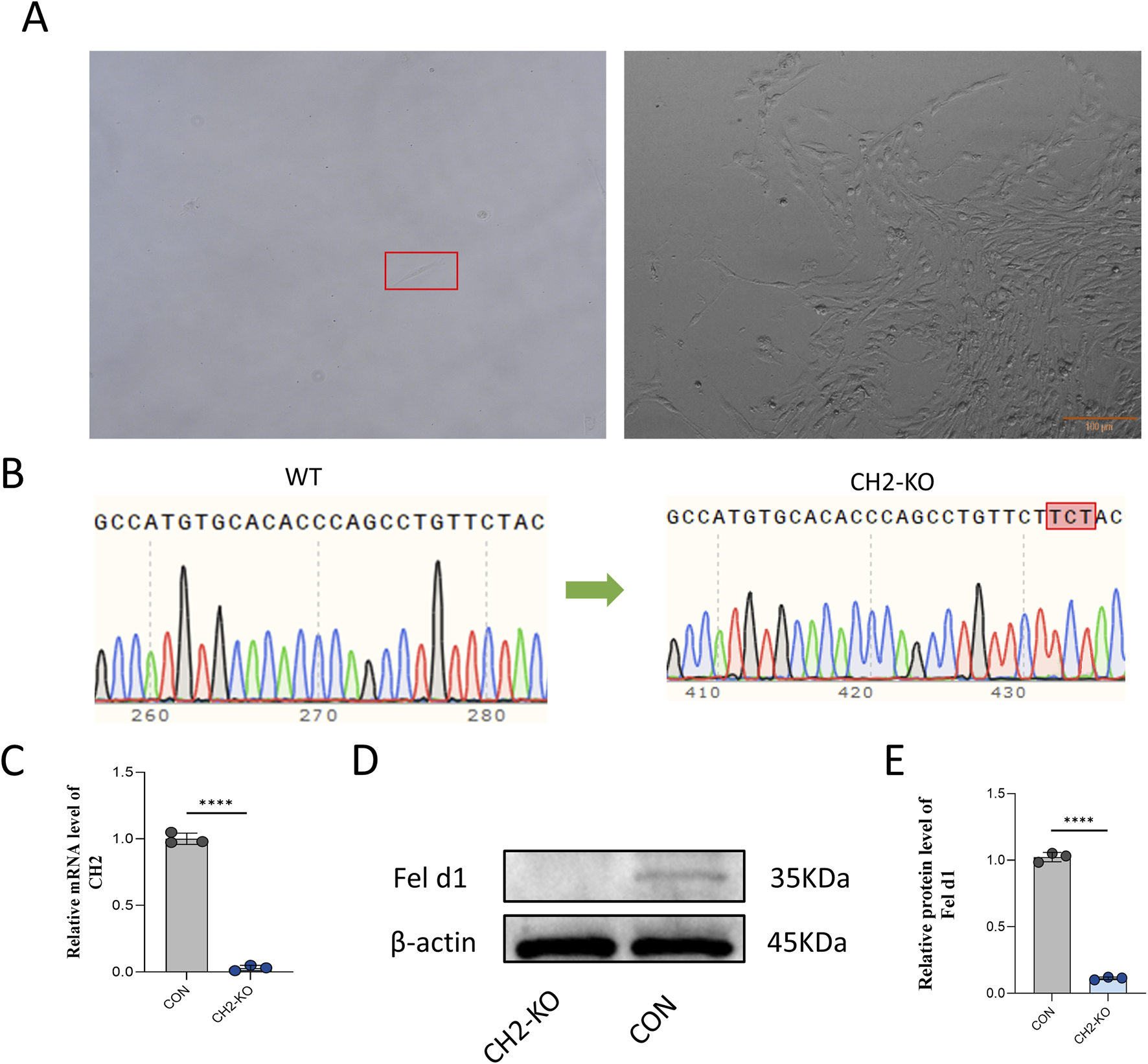 Generation of CH2-Knockout Monoclonal Cells. (A) Monoclonal selection of cells after puromycin screening. Scale bar: 100 µm. (B) Sanger sequencing showing a three-base insertion mutation at the target site in the CH2-KO clone. (C) qRT-PCR results for CH2 mRNA expression in control and KO cells. (D) Western blot analysis of Fel d1 protein expression in control and KO cells. (E) Quantification of Fel d1 protein expression levels. Data were obtained from three independent experiments. Data are presented as mean ± standard deviation, and P values were calculated by two-tailed unpaired t-test. Significant differences are indicated by **** (P < 0.0001).