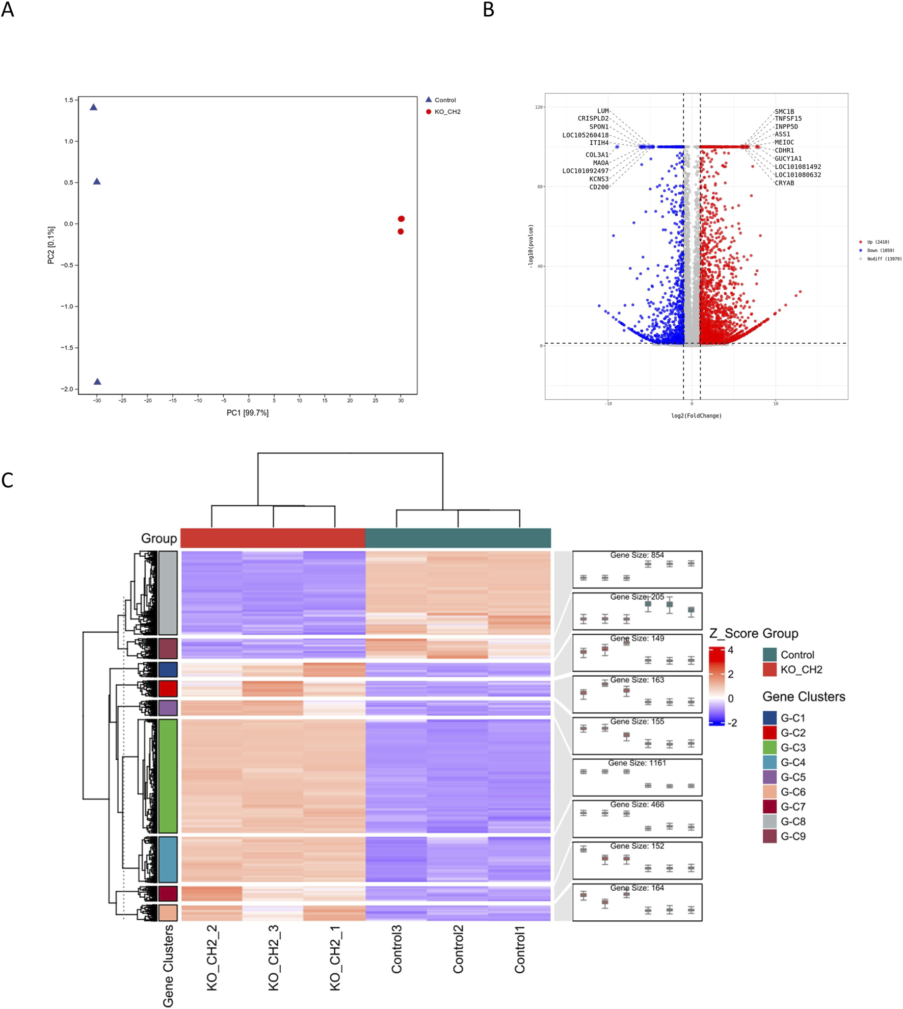 Transcriptomic Profiling Reveals Global Reprogramming Induced by CH2 Knockout. (A) Principal component analysis (PCA) showing distinct transcriptomic separation between control and CH2-KO groups. (B) Volcano plot showing DEGs in CH2-KO versus control group. (C) Hierarchical clustering heatmap showing 9 gene expression clusters among DEGs.