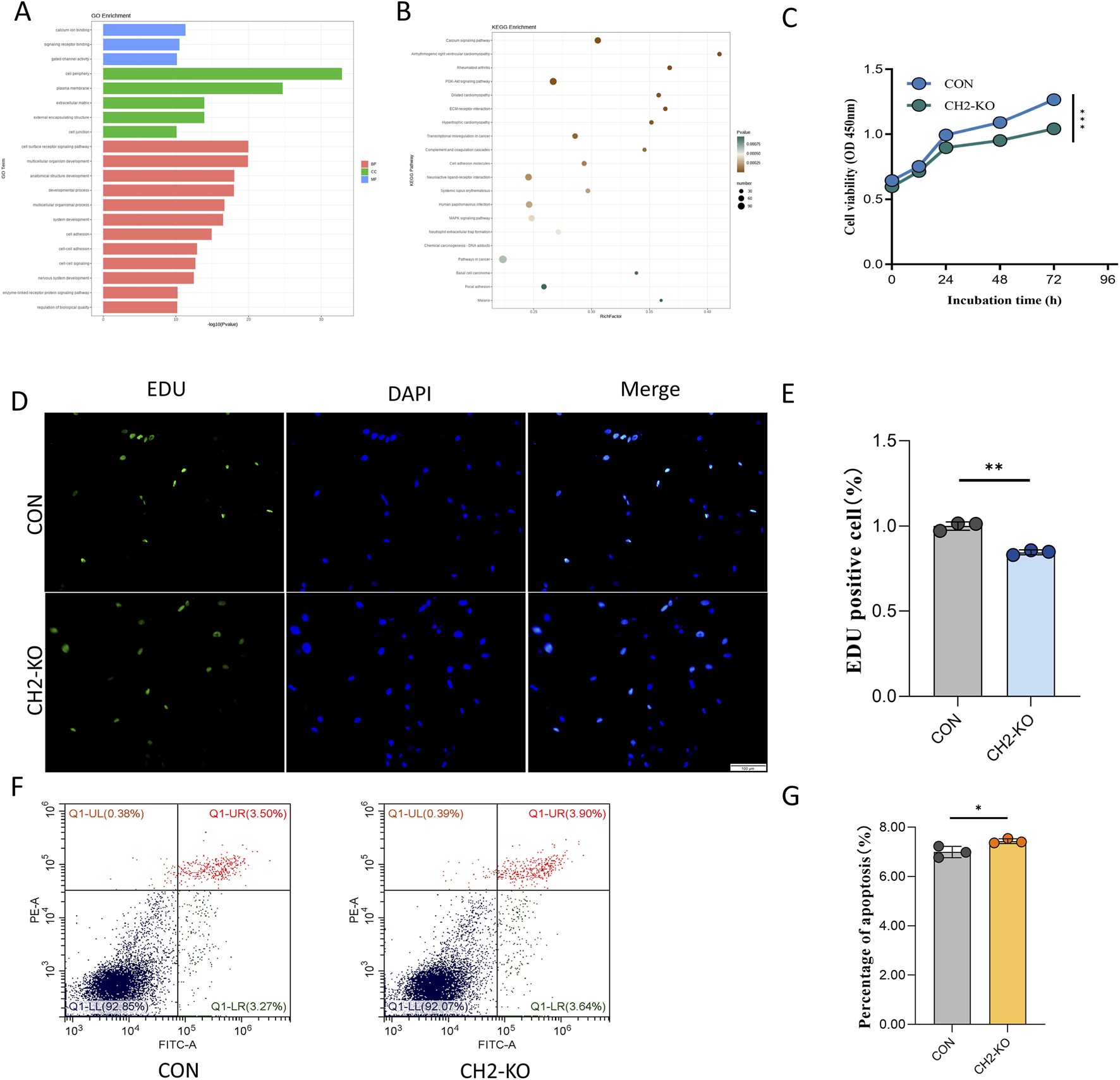 Cell viability was determined using the Cell Counting Kit-8 (CCK-8; Beyotime, China, Cat# C0038). Control and CH2-KO cells were seeded in 96-well plates at a density of 3 × 103 cells/well and cultured for 12, 24, 48, and 72 h. At each time point, 10 μL of CCK-8 reagent was added to each well, followed by incubation at 37 °C with 5% CO2 for 2 h. The absorbance was then measured at 450 nm using a microplate reader. Cell proliferation was directly assessed using the BeyoClick™ EdU Cell Proliferation Kit with Alexa Fluor 594 (Beyotime, China, C0071S) according to the manufacturer’s protocol. Briefly, cells were seeded in 24-well plates and incubated with 10 μM EdU for 2 h at 37 °C. After fixation and permeabilization, the Click-iT reaction cocktail was applied to detect the incorporated EdU. Cell nuclei were counterstained with DAPI. Images were captured using a fluorescence microscope, and the percentage of EdU-positive cells was quantified from at least three random fields per well using ImageJ software.
