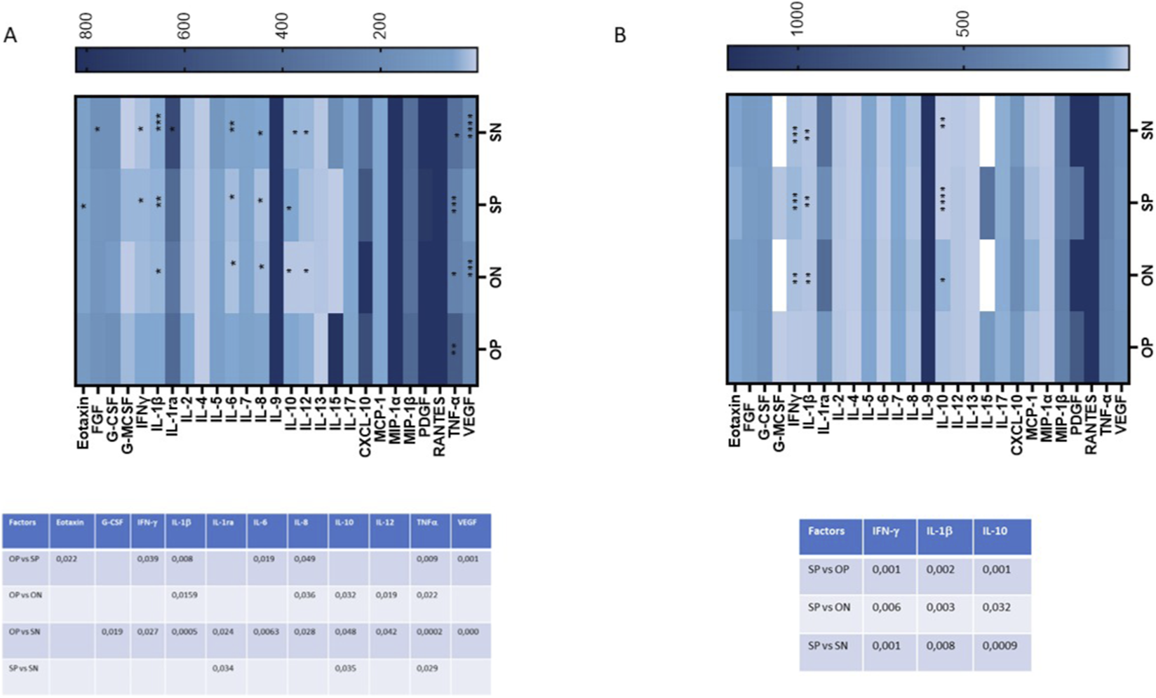 By contrast, only a limited number of cytokines were upregulated in the SPs compared to others. Specifically, SPs vs. SNs showed increased levels of IL-1ra (p ≤ 0.05), IL-10 (p ≤ 0.05), and TNF-α (p ≤ 0.05) (Figure 5A).
