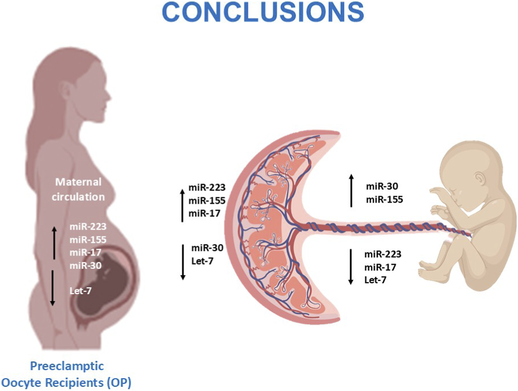 However, the landscape shifts markedly in women developing preeclampsia. Indeed, in our results, preeclamptic oocyte recipients exhibit a highly disrupted miRNA and cytokine profile both in the placenta and maternal plasma, indicative of an intricate immunological dysregulation potentially driven by specific miRNAs.