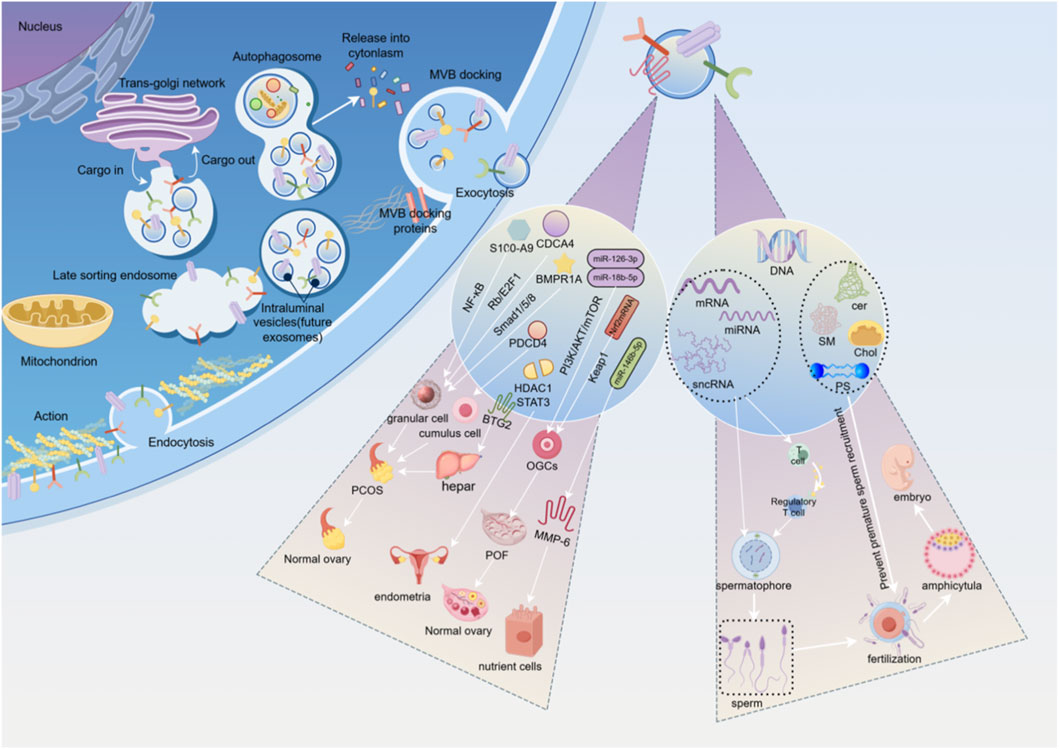 Figure 1. This is an original image created with Figdraw. (1) Left side of the intracellular process diagram. (2) Intermediate regulatory pathway and cell type diagram. The EVs in the follicular fluid of PCOS patients are rich in S100-A9, which significantly exacerbates inflammation and disrupts steroidogenesis by activating the NF-κB signaling pathway, playing a vital role in regulating ovarian granulosa cell function. MiRNA is differentially expressed in the EVs of follicular fluid from PCOS patients and inhibits ovarian granulosa cell proliferation and induces ovarian granulosa cell senescence by blocking the Rb/E2F1 signaling pathway mediated by CDCA4. MiRNA from follicular fluid EVs in PCOS targets the recombinat BMPR1A and blocks the Smad1/5/8 signaling pathway, promoting apoptosis of ovarian granulosa cells. EVs derived from MSCs, promote cell proliferation and inhibit apoptosis in cumulus cells by targeting the programmed cell death effector PDCD4 in the PCOS. In the PCOS rat model induced by dehydroepiandrosterone, EVs from AMSC and their derived EVs can be partially mediated by miR-21-5P, regulating liver glucose homeostasis by targeting BTG2, significantly alleviating multiple phenotypes of PCOS rats, including metabolic abnormalities, polycystic ovaries, and infertility. EVs promote the proliferation, migration, and invasion of ESCs, inhibit ESCs apoptosis, and enhance the progression of endometriosis and angiogenesis by regulating the HDAC1 axis and activating the STAT3-mediated inflammation. EVs derived from HUCMSCs carry miR-126-3p, which targets the upregulation of the PI3K/AKT/mTOR pathway to promote angiogenesis in POF and reduce apoptosis in primary rat OGCs. EVs extracted from follicular fluid activated AKT by miR-18b-5p, opened PI3K signaling pathway, and promoted steroid synthesis. Nrf2mRNA plays a key role in mediated ovarian angiogenesis by downregulating Keap1. MiR-146b-5p can reduce the invasiveness of trophoblasts by acting on MMP-6, leading to the development of RM. (3) Right side exosome contents and reproductive process diagram. Sperm extracellular vesicles (EVs) primarily originate from the testis, epididymis, and prostate, and are accordingly classified as testicular vesicles, epididymal vesicles, and prostatic vesicles. As multifunctional nanocarriers, they transport proteins, nucleic acids (such as DNA, mRNA, miRNA, lncRNA), lipids (cer, SM, Chol, PS), and metabolites derived from parental cells. They play essential roles in regulating sperm maturation, motility, capacitation, and the acrosome reaction, thereby facilitating sperm-egg binding, improving fertilization rates, and supporting the formation of healthy embryos.