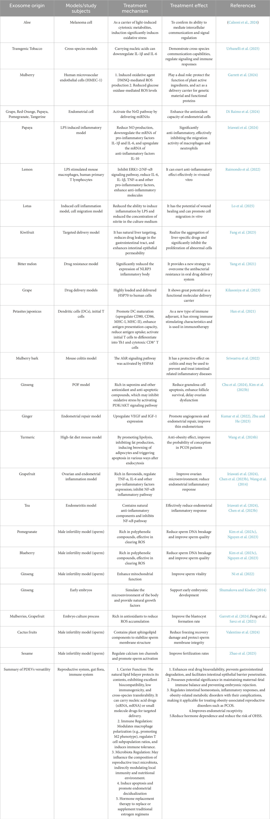 PDEVs also contribute to regulating intestinal homeostasis, inflammatory responses, and metabolic disorders associated with obesity. Emerging evidence suggests that PDEVs can modulate the reproductive tract microbiota composition, indirectly influencing local immunity and the nutritional microenvironment. Although complex metabolic diseases remain challenging to cure, PDEVs offer a viable strategy for managing conditions such as obesity-related reproductive disorders (Niu et al., 2023; Emmanuela et al., 2024; Liu et al., 2025). For instance, Reconstructed Nanovesicles (Rec-tNVs) from turmeric exhibit dose-dependent lipid-lowering effects via multiple mechanisms: promoting lipolysis, inhibiting adipogenesis, inducing adipocyte browning, and triggering apoptosis post-endocytosis. These vesicles provide a novel weight-management strategy for PCOS patients, improving conception rates and establishing a new paradigm for plant-derived nanotherapies (Wang et al., 2024b). Similarly, mulberry bark-derived EVs (MBELN) activate the aryl hydrocarbon receptor (AhR) signaling pathway through HSPA8, alleviating colitis in mouse models. This effect involves the COPS8-mediated interorgan communication pathway, regulating inflammatory responses in microbiota-rich intestinal environments. MBELN thus represents a promising candidate for treating gut-inflammatory diseases and associated reproductive disorders such as PCOS (Sriwastva et al., 2022).