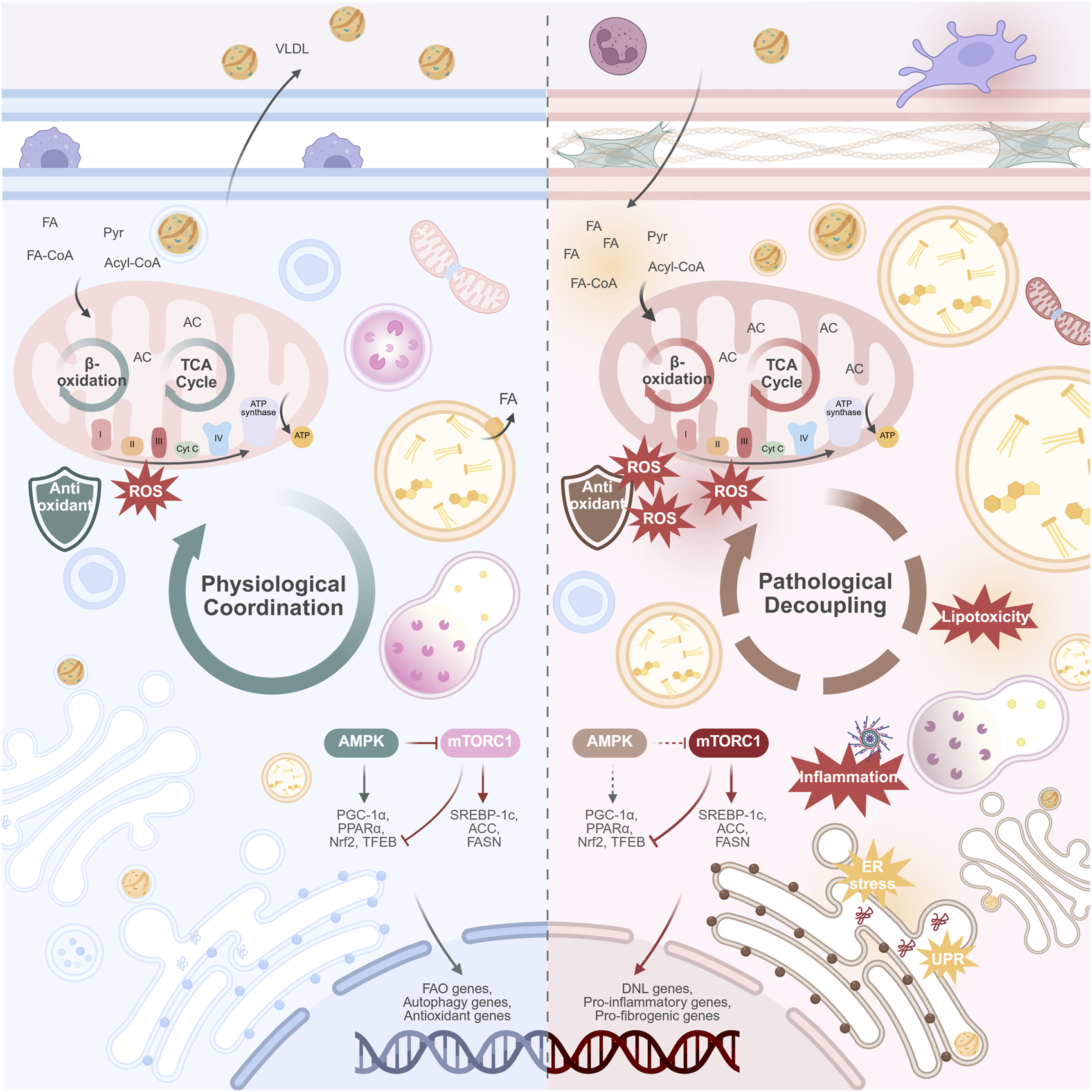 Physiological coordination versus pathological decoupling of organelles in the progression of MASLD. (Left panel) Physiological coordination. In the healthy hepatocyte, organelles work in synchrony. This coordinated state supports metabolic flexibility: efficient mitochondrial β-oxidation and TCA cycle function; balanced lipid storage and lipolysis; robust VLDL secretion; and effective protein handling and quality control. The nutrient-sensing AMPK and mTORC1 pathways are in equilibrium, adapting to energy availability. (Right panel) Pathological decoupling. In MASLD, chronic metabolic stress disrupts organelle communication. This decoupling manifests as mitochondrial dysfunction (impaired β-oxidation, ROS overproduction); ER stress; impaired lysosomal function and blocked autophagic flux; and the formation of enlarged LDs with reduced lipolysis. VLDL secretion is suppressed, contributing to hepatic lipid accumulation. The AMPK/mTORC1 axis is dysregulated, with diminished AMPK activity and persistent mTORC1 activation, promoting lipid synthesis and suppressing catabolic processes. This collective failure drives hepatocyte injury, release of damage-associated molecules, and activation of inflammatory pathways, which ultimately promote hepatic fibrosis. Abbreviations: ACC, acetyl-CoA carboxylase; AC, Acyl-CoA; AMPK, AMP-activated protein kinase; DNL, de novo lipo-genesis; ER, endoplasmic reticulum; FA, fatty acid; FA-CoA, Fatty acyl-CoA; FAO, fatty acid oxidation; FASN, fatty acid synthase; MASLD, metabolic dysfunction-associated steatotic liver disease; mTORC1, mechanistic target of rapamycin complex 1; Nrf2, nuclear factor erythroid 2-related factor 2; PGC-1α, peroxisome proliferator-activated receptor gamma coactivator 1-alpha; PPARα, peroxisome proliferator-activated receptor alpha; Pyr, Pyruvate; ROS, reactive oxygen species; SREBP-1c, sterol regulatory element-binding protein 1c; TCA, tricarboxylic acid cycle; TFEB, transcription factor EB; UPR, unfolded protein response. Created in BioRender.