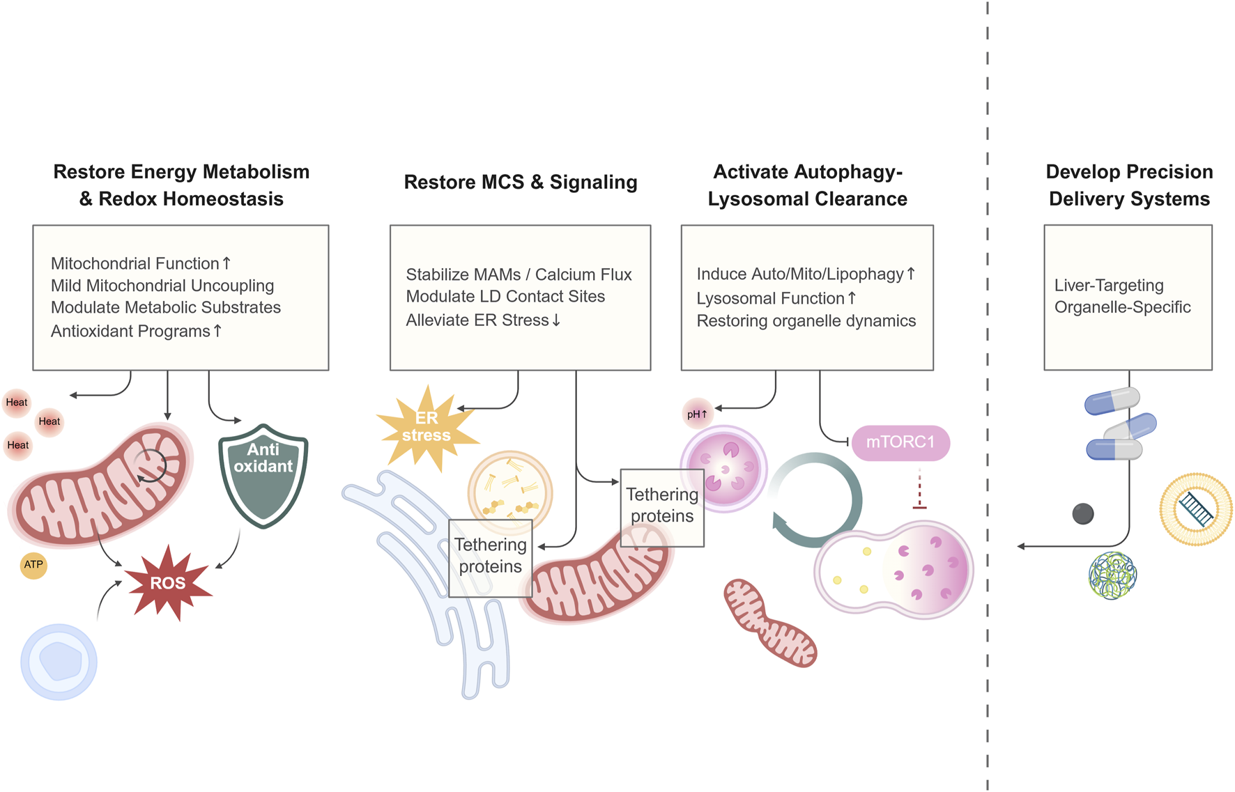 Abbreviations: ACC, Acetyl-CoA carboxylase; AMPK, AMP-activated Protein Kinase; ATF4, Activating Transcription Factor 4; BAT, brown adipose tissue; BCAA, Branched-Chain Amino Acid; CHOP, C/EBP, homologous protein; CRMP, Controlled-release mitochondrial protonophore; CsA, Cyclosporin A; DGAT2, Diacylglycerol O-Acyltransferase 2; DNP, 2,4-Dinitrophenol; eIF2α, Eukaryotic Initiation Factor 2 Alpha; ER, endoplasmic reticulum; ER-LD, Endoplasmic Reticulum-Lipid Droplet; ERS, ER, stress; FDA, food and drug administration; GLP-1, Glucagon-like Peptide-1; GPR119, G Protein-Coupled Receptor 119; HSC, hepatic stellate cell; IRE1α, Inositol-requiring Enzyme 1 Alpha; MAM, Mitochondria-Associated Membrane; MASH, Metabolic Dysfunction-associated Steatohepatitis; mPTP, mitochondrial permeability transition pore; MPC, mitochondrial pyruvate carrier; mTORC1, Mechanistic Target of Rapamycin Complex 1; NF-κB, Nuclear Factor Kappa-Light-Chain-Enhancer of Activated B Cells; Nrf2, Nuclear Factor Erythroid 2-Related Factor 2; OATP1B1, Organic Anion Transporting Polypeptide 1B1; PC, phosphatidylcholine; PE, phosphatidylethanolamine; PERK, PKR-like ER, kinase; PEX2, Peroxisomal Biogenesis Factor 2; PGC-1α, Peroxisome Proliferator-activated Receptor Gamma Coactivator 1-alpha; PLIN5, Perilipin 5; PPARα, Peroxisome Proliferator-activated Receptor Alpha; PPARγ, Peroxisome Proliferator-activated Receptor Gamma; PRS, Prolyl-tRNA, synthetase; ROS, reactive oxygen species; RXR, Retinoid X Receptor; SERCA, Sarco/Endoplasmic Reticulum Ca2+ ATPase; siRNA, Small Interfering RNA; SIRT3, Sirtuin 3; SREBP-1c, Sterol Regulatory Element-Binding Protein 1c; SREBP2, Sterol Regulatory Element-Binding Protein 2; TFEB, Transcription Factor EB; THC, tetrahydrocurcumin; THR-β, thyroid hormone receptor beta; TPP+, triphenylphosphonium; ULK1, Unc-51, Like Autophagy Activating Kinase 1; UPR, unfolded protein response.