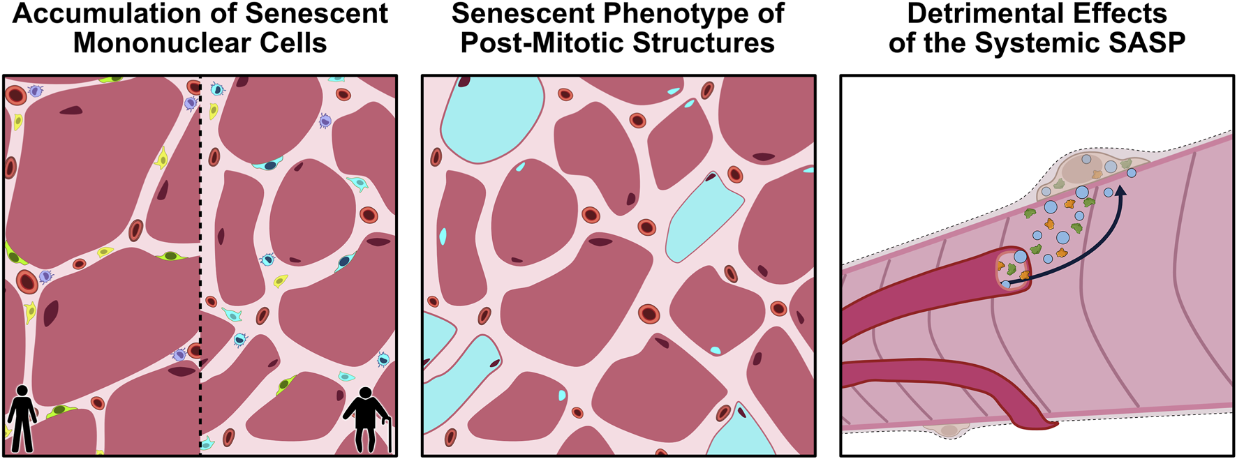 Proposed avenues through which cellular senescence could influence aging skeletal muscle. Panel 1: With aging, senescent mononuclear cells (blue) accumulate within the muscle microenvironment, leading to a loss of normal cellular function and impairments in muscle regeneration. Panel 2: Emerging evidence suggests that even post-mitotic structures, such as myofibers and myonuclei, may acquire a senescence-like phenotype (blue), characterized by persistent DNA-damage signalling, mitochondrial dysfunction, and secretion of SASP factors. Panel 3: The chronic SASP produced by tissue-resident and circulating senescent cells can enter the systemic circulation, propagating inflammation and dysfunction in other tissues, such as skeletal muscle. Together, these processes can compromise the homeostatic status of aging skeletal muscle. SASP, senescence-associated secretory phenotype.