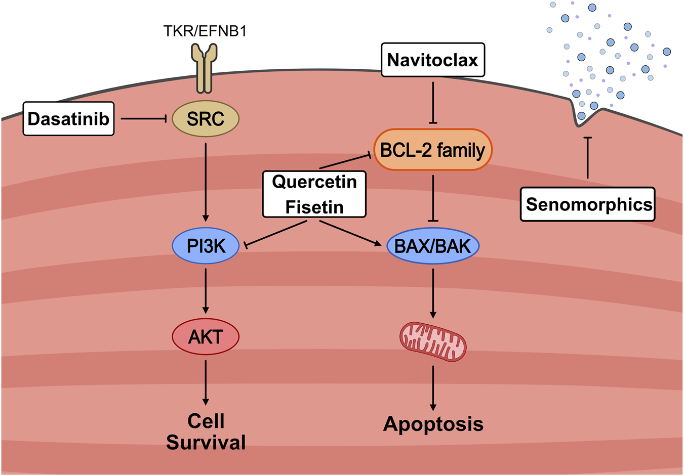 Mechanistic overview of senotherapeutic strategies targeting senescent cell survival pathways. Senescent cells resist apoptosis through the activation of pro-survival signalling cascades, including SRC/PI3K/AKT and BCL-2 family members. Senolytic agents selectively disrupt these defenses: Dasatinib inhibits SRC signalling, Quercetin and Fisetin suppress PI3K and BCL-2 pathways, and Navitoclax directly antagonizes anti-apoptotic BCL-2 proteins, thereby promoting mitochondrial-mediated apoptosis via BAX/BAK activation. In contrast, senomorphics act to attenuate the senescence-associated secretory phenotype (SASP) without inducing cell death. Together, these approaches aim to reduce the burden or harmful effects of senescent cells in aging muscle.