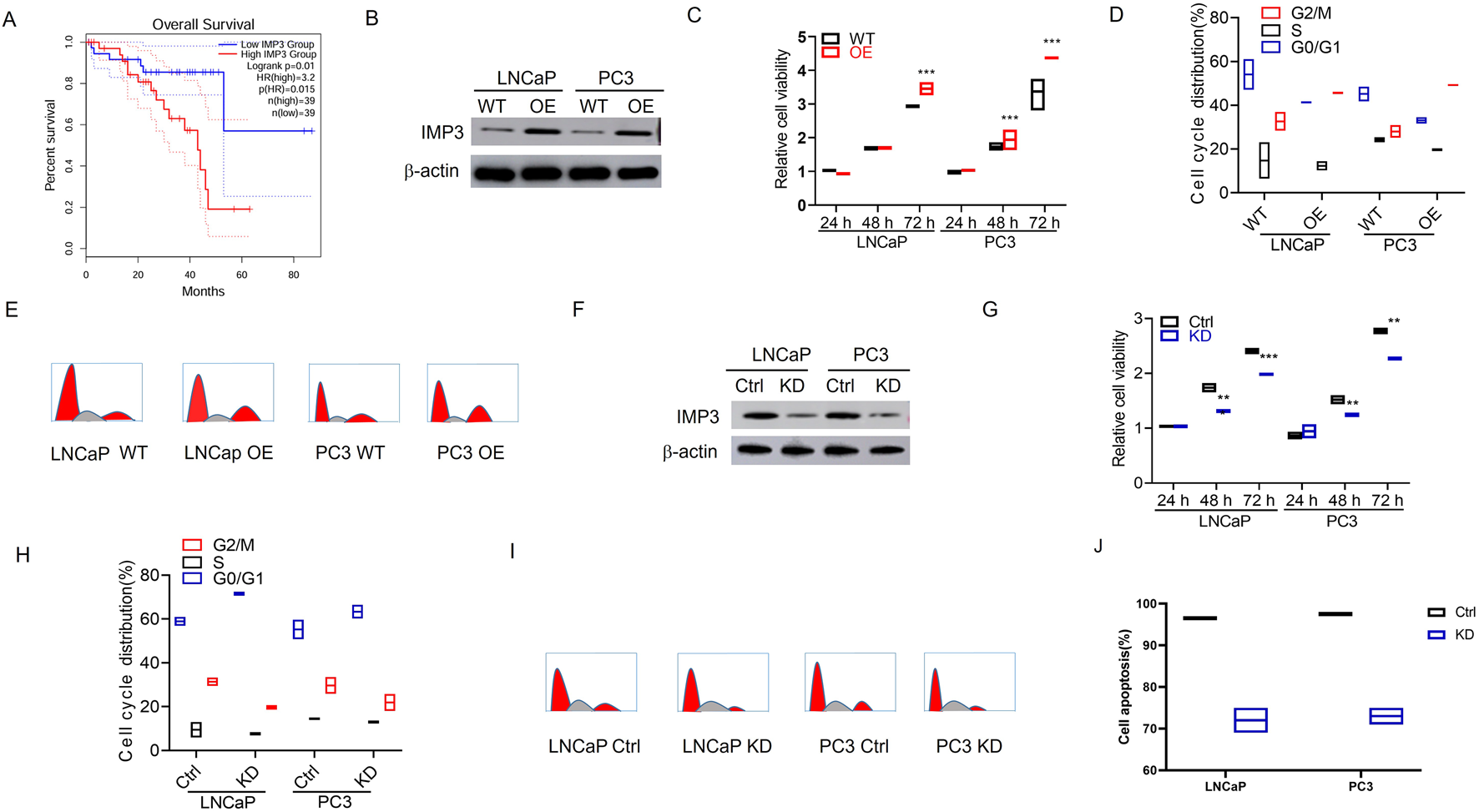 High IMP3 expression indicates poor clinical outcome and promotes tumor growth in prostate cancer. (A) Elevated IMP3 expression was associated with poorer event-free survival (EFS). (B) Western blot analysis confirmed stable overexpression of IMP3 in LNCaP and PC3 cells. (C) CCK-8 assays showed that IMP3 overexpression significantly enhanced the proliferation of LNCaP and PC3 cells (p < 0.001). (D,E) Flow cytometry analysis demonstrated an increased proportion of cells in the G2/M phase in IMP3-overexpressing cells relative to wild-type controls (p < 0.05). (F) Western blot analysis confirmed efficient knockdown of IMP3 in LNCaP and PC3 cells using lentiviral shRNA. (G) Cell proliferation was markedly reduced following IMP3 knockdown (p < 0.001). (H,I) IMP3 silencing led to a significant decrease in the G2/M phase cell population (p < 0.01). (J) Annexin V/PI staining revealed that IMP3 knockdown induced apoptosis in PC cells.
