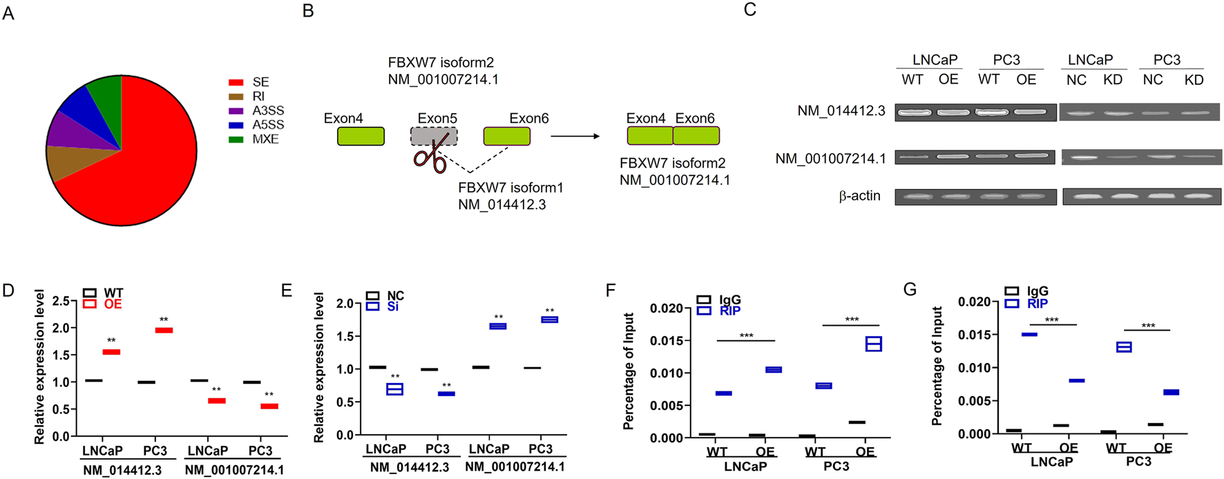 IMP3 regulates alternative splicing events in prostate cancer cells, including exon skipping of FBXW7. (A) RIP-seq analysis using HA antibody in IMP3-overexpressing prostate cancer cells identified 1,156 significant alternative splicing (AS) events, with exon skipping accounting for the majority (67.46%). (B) Among these, exon 5 skipping of the FBXW7 gene was one of the most prominently altered events in IMP3-OE cells. (C–E) Quantitative PCR showed that the expression of the alternatively spliced isoform FBXW7-NM_001007214.1 was significantly upregulated in LNCaP and PC3 cells overexpressing IMP3, while its expression was markedly decreased in IMP3-knockdown cells compared to controls. (F,G) RIP-PCR using an HA-tag antibody confirmed the direct binding of IMP3 to FBXW7-NM_001007214.1. Elevated IMP3 expression promoted the production of this isoform, supporting a regulatory role of IMP3 in exon skipping of FBXW7.