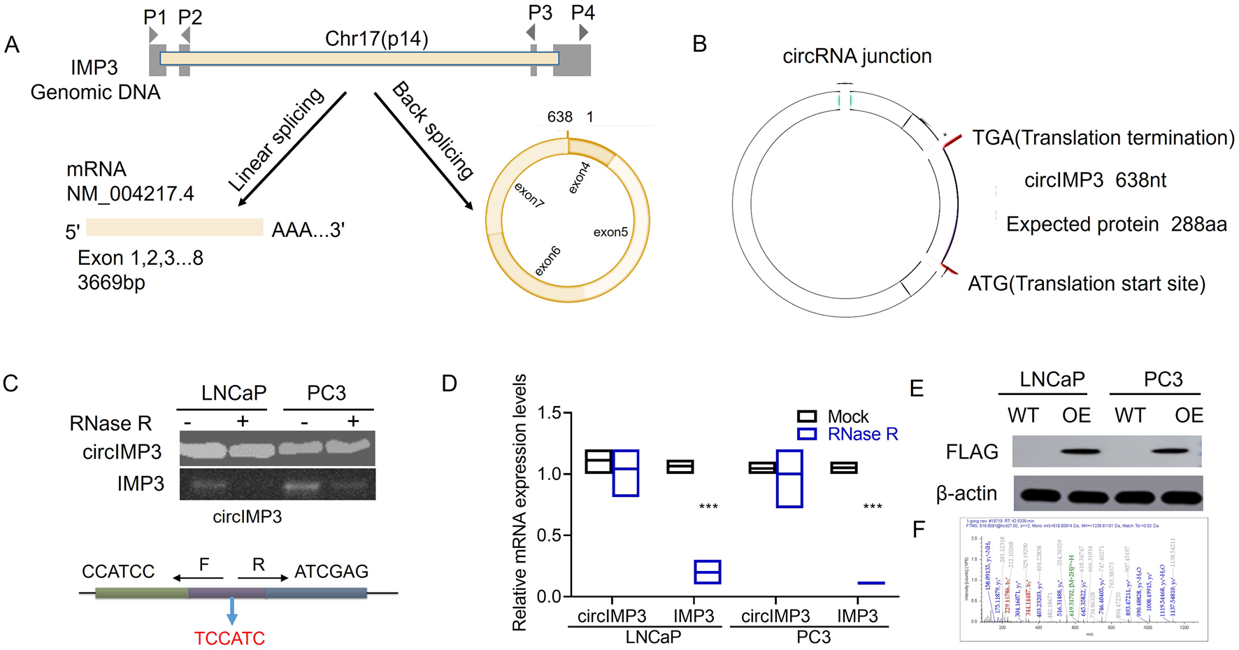 Diagram illustrating circIMP3 formation and its expression in prostate cancer. (A) Shows linear and back splicing of IMP3 genomic DNA. (B) Details circIMP3 circRNA with protein translation sites. (C) Gel image of circIMP3 presence in LNCaP and PC3 cells. (D) Bar graph comparing mRNA expression levels with and without RNase R treatment. (E) Western blots showing FLAG and β-actin expression in LNCaP and PC3 cells. (F) Mass spectrometry data of peptide analyses.