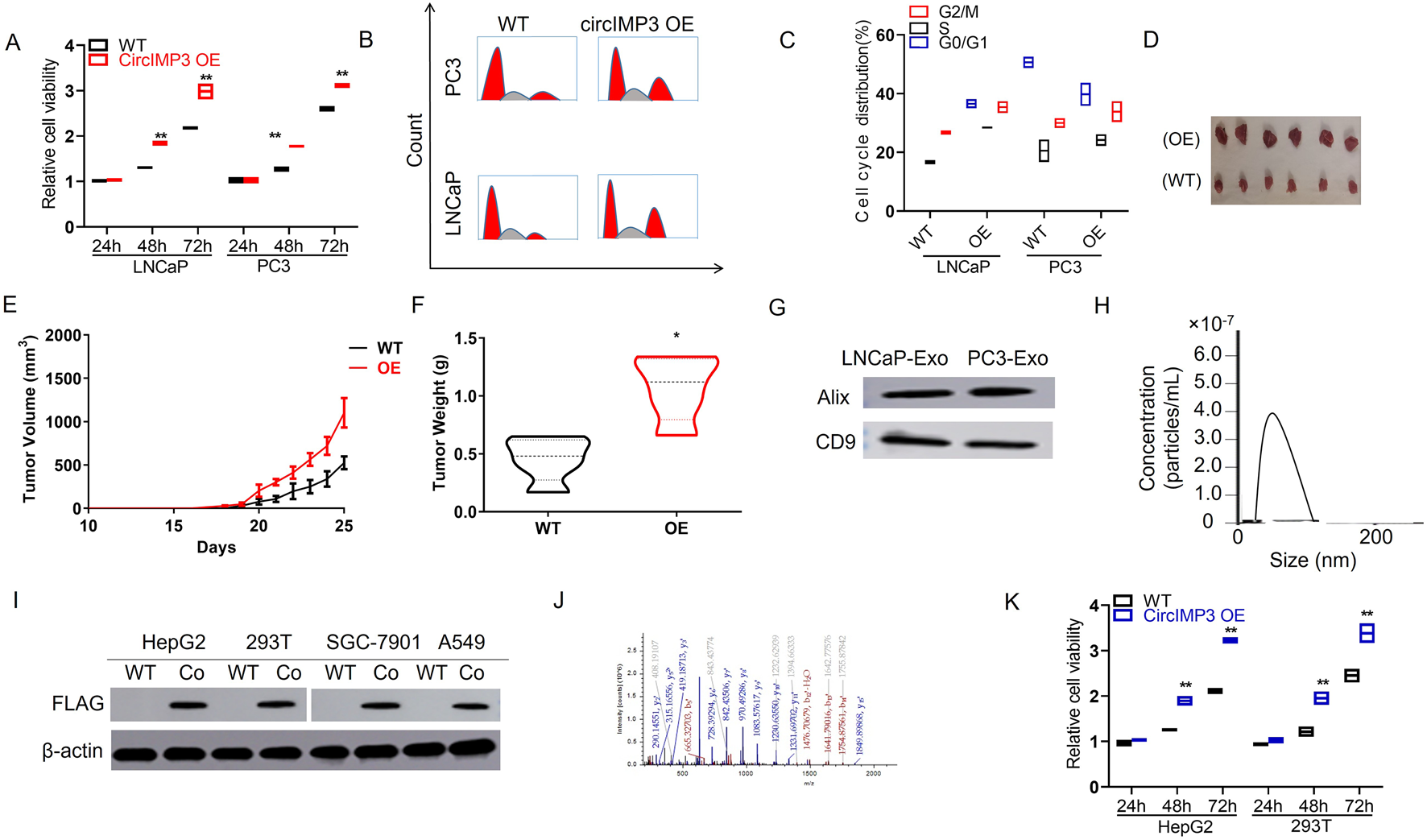 Prostate cancer cells secrete circIMP3 via exosomes to promote tumor growth and intercellular communication in the tumor microenvironment. (A) Overexpression of circIMP3 significantly enhanced proliferation of LNCaP and PC3 cells (p < 0.05). (B,C) Cell cycle analysis showed an increased proportion of cells in the G2/M phase upon circIMP3 overexpression. (D–F)In vivo, tumors derived from circIMP3-overexpressing LNCaP cells grew faster and exhibited significantly higher tumor weight and volume compared to wild-type controls (p < 0.05). (G) Western blot confirmed exosomal markers Alix and CD9 in exosomes isolated from LNCaP and PC3 culture supernatants. (H) Dynamic light scattering (DLS) analysis revealed exosome particle size averaging ∼50 nm. (I) FLAG immunostaining detected circIMP3_288aa protein in wild-type HepG2, 293T, RAW264.7, and A549 cells co-cultured with circIMP3-overexpressing Eca109 cells in a transwell system. (J) Mass spectrometry analysis confirmed the presence of circIMP3_288aa-derived peptides in recipient cells, indicating functional transfer and translation. (K) Co-cultured HepG2 and 293T cells exhibited significantly increased proliferation compared to non-co-cultured controls (p < 0.01).