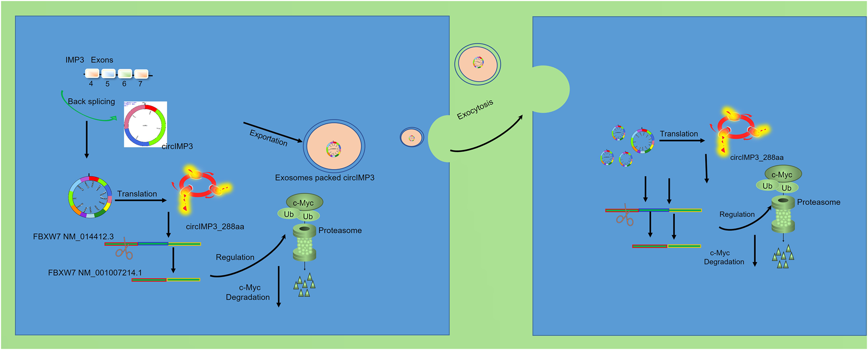 We identified circIMP3, which is significantly upregulated in both prostate cancer tissues and peripheral blood of patients. CircIMP3 contains an internal ribosome entry site (IRES) and encodes a previously uncharacterized 288-amino-acid protein, circIMP3_288aa. Functional assays revealed that circIMP3_288aa promotes cell proliferation in vitro and accelerates tumor growth in vivo. Mechanistically, circIMP3_ 288aa regulates the alternative splicing of FBXW7, leading to impaired c-Myc ubiquitination and stabilization, which enhances oncogenic signaling. RIP-seq analysis identified over 2,000 alternative splicing events regulated by IMP3, with a notable enrichment in pathways related to ubiquitin-mediated proteolysis. Furthermore, circIMP3 is secreted into the TME via exosomes, where it is taken up by recipient cells, contributing to their proliferation.