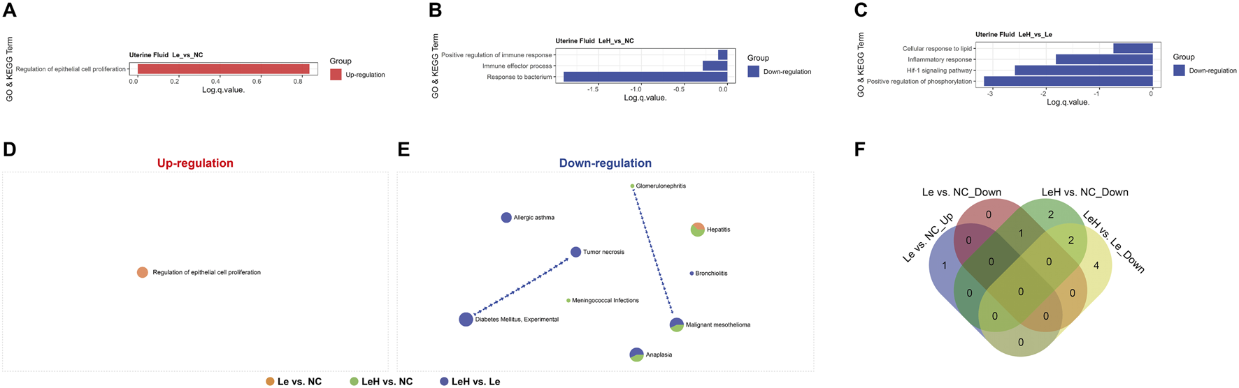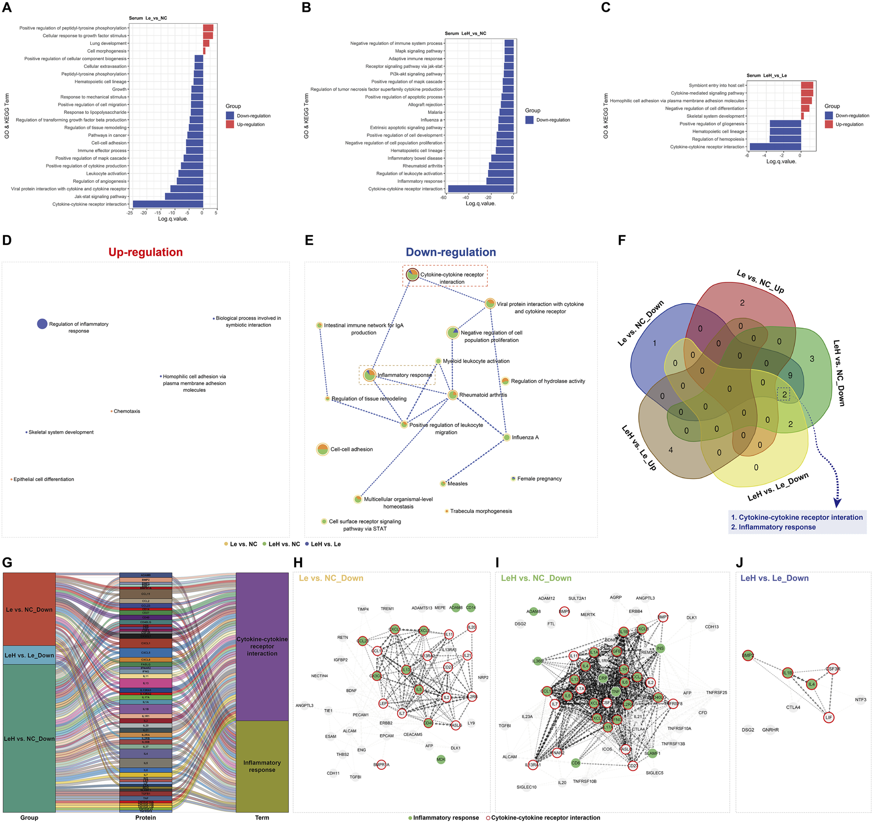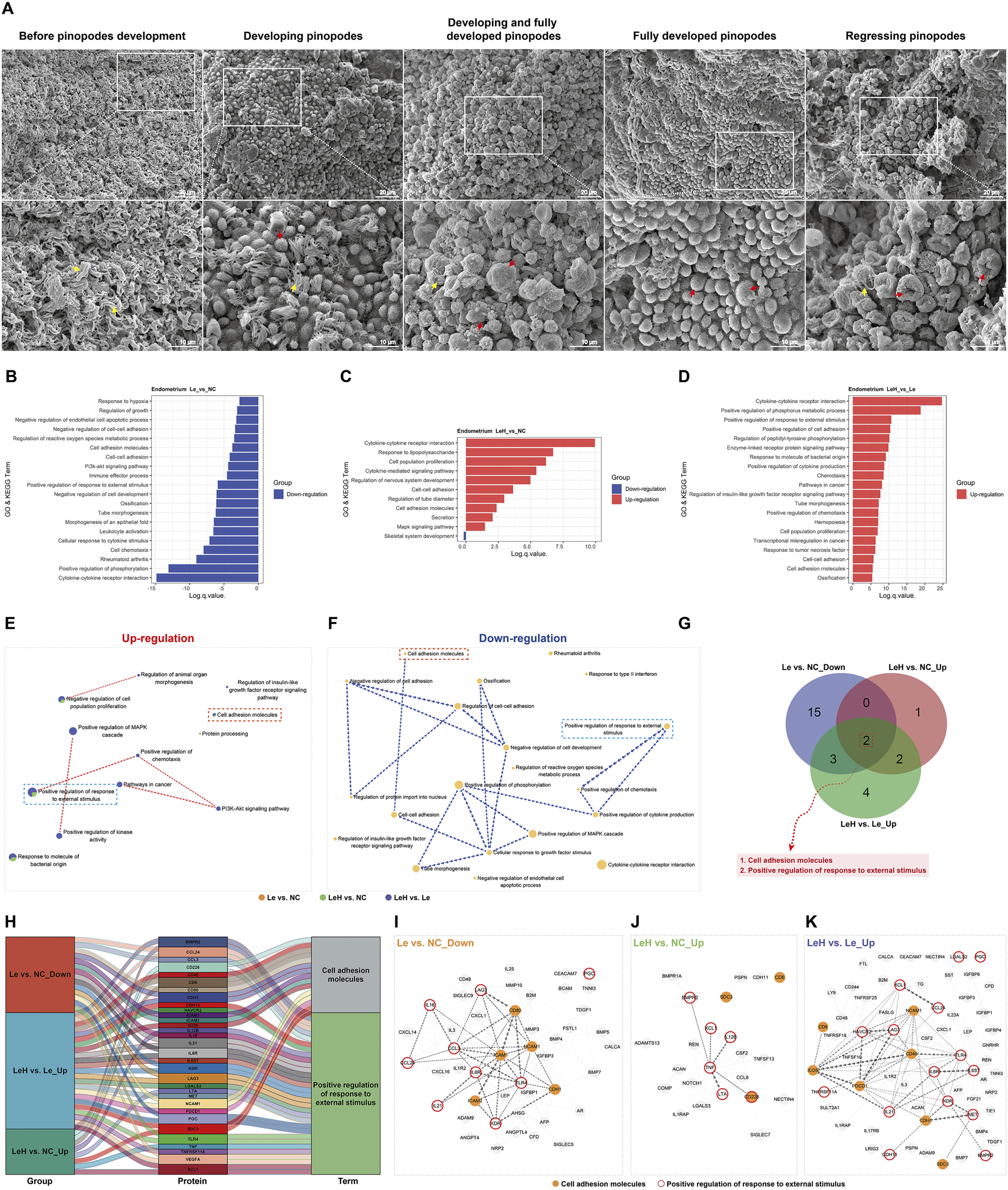 Integrated assessment of endometrial receptivity in Le/LeH/NC groups. Ultrastructural dynamics of pinopodes analyzed by SEM on D3 (pre-FET, n = 15) and D5 (implantation window, n = 18) post-ovulation. Yellow arrowheads: microvilli; red arrowheads: pinopodes. Scale bars: 20 m (low magnification), 10 m (high magnification) (A). Proteomic profiling of D3 endometrial tissues (Le: n = 5, LeH: n = 6, NC: n = 5) using 440-protein arrays, with GO and KEGG enrichment analysis (B–D). Metascape analysis of up- and downregulated DEPs (E,F). Venn diagram of shared signaling pathways (G). Sankey diagram of group-DEP-pathway relationships (H). STRING PPI networks for: Le vs. NC (downregulated DEPs), LeH vs. NC (upregulated DEPs), and LeH vs. Le (upregulated DEPs) (I–K).