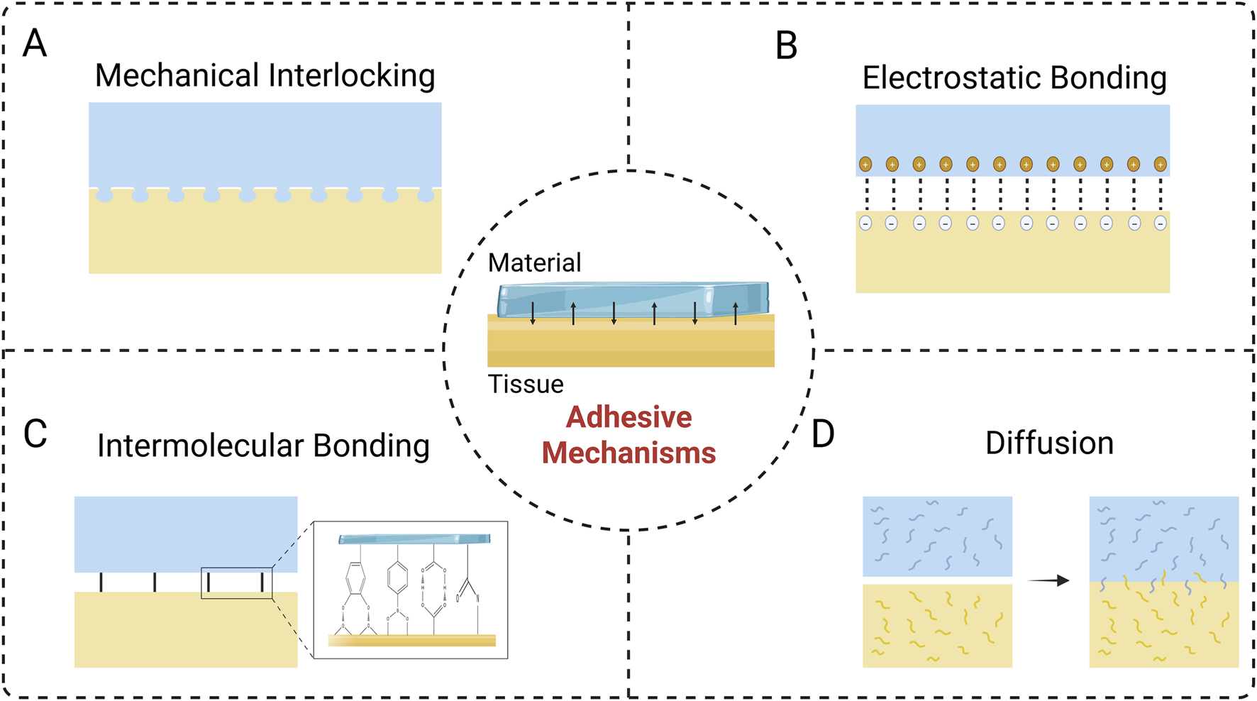 Adhesive Mechanisms at the material-tissue interface. (A) Mechanical interlocking. (B) Electrostatic bonding. (C) Intermolecular bonding. (D) Diffusion.