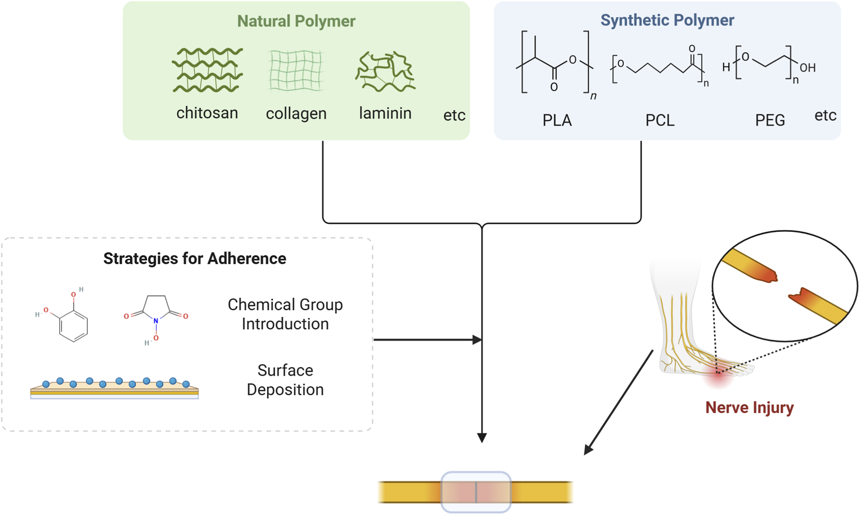 Mechanism for natural or synthetic polymer to repair nerve injury. Natural polymer based on chitosan, collagen, laminin and etc., as well as synthetic polymer based on PLA, PCL, PEG and etc., can acquire robust adhesion capacity via strategies such as chemical group introduction and surface deposition. Consequently, these materials can adhere to the surface of the damaged nerve and facilitate nerve regeneration.