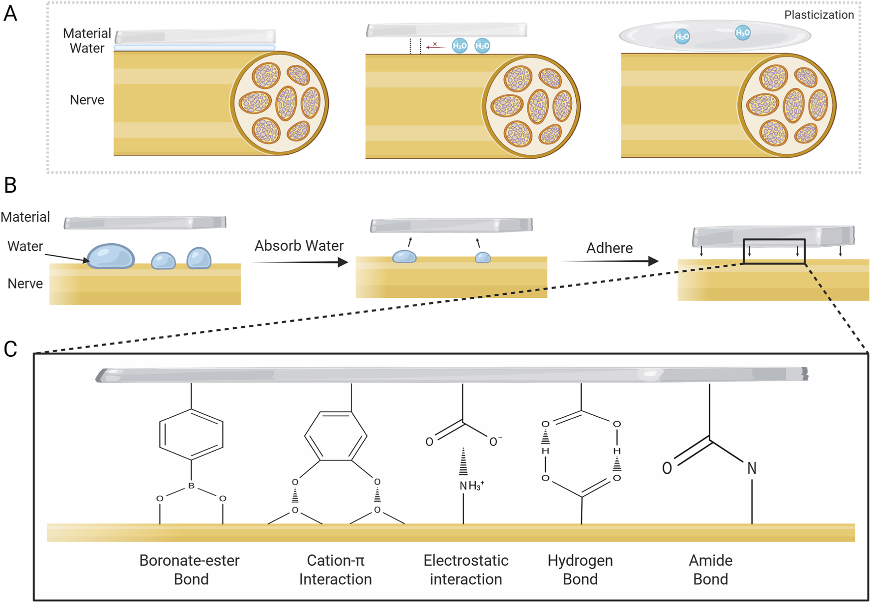 Challenges to adhesion posed by water and mechanism of wet adhesion. (A) Negative effects of water on adhesion. (B) Typical adhesion mechanism of wet-adhesion interface. Wet adhesives adsorb water on tissue surface and swell, then adhere to damaged nerve via various mechanisms. (C) Representative adhesion mechanisms at the material-tissue interface for wet adhesives.