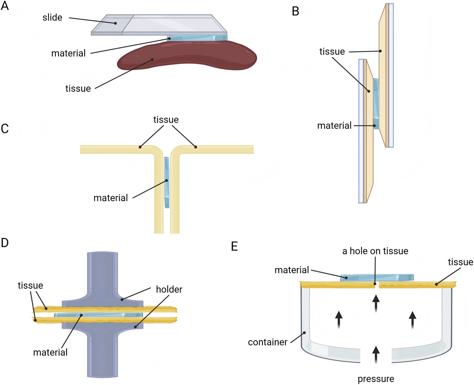 Methods for evaluating adhesion property of nerve repair materials. (A) Visual assessment. (B) Lap-shear test. (C) Peeling test. (D) Tensile test. (E) Bursting pressure test.