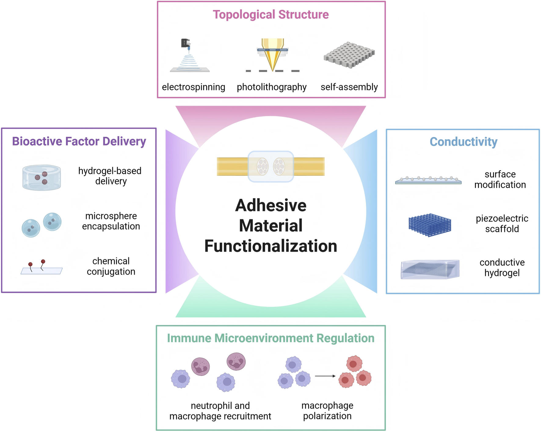 Functionalization of adhesive nerve repair materials. Besides robust adhesion performance, ideal nerve injury repair materials also have other indispensable requirement to achieve biological functions, such as bioactive factor delivery, conductivity, topological structure and immune microenvironment regulation.