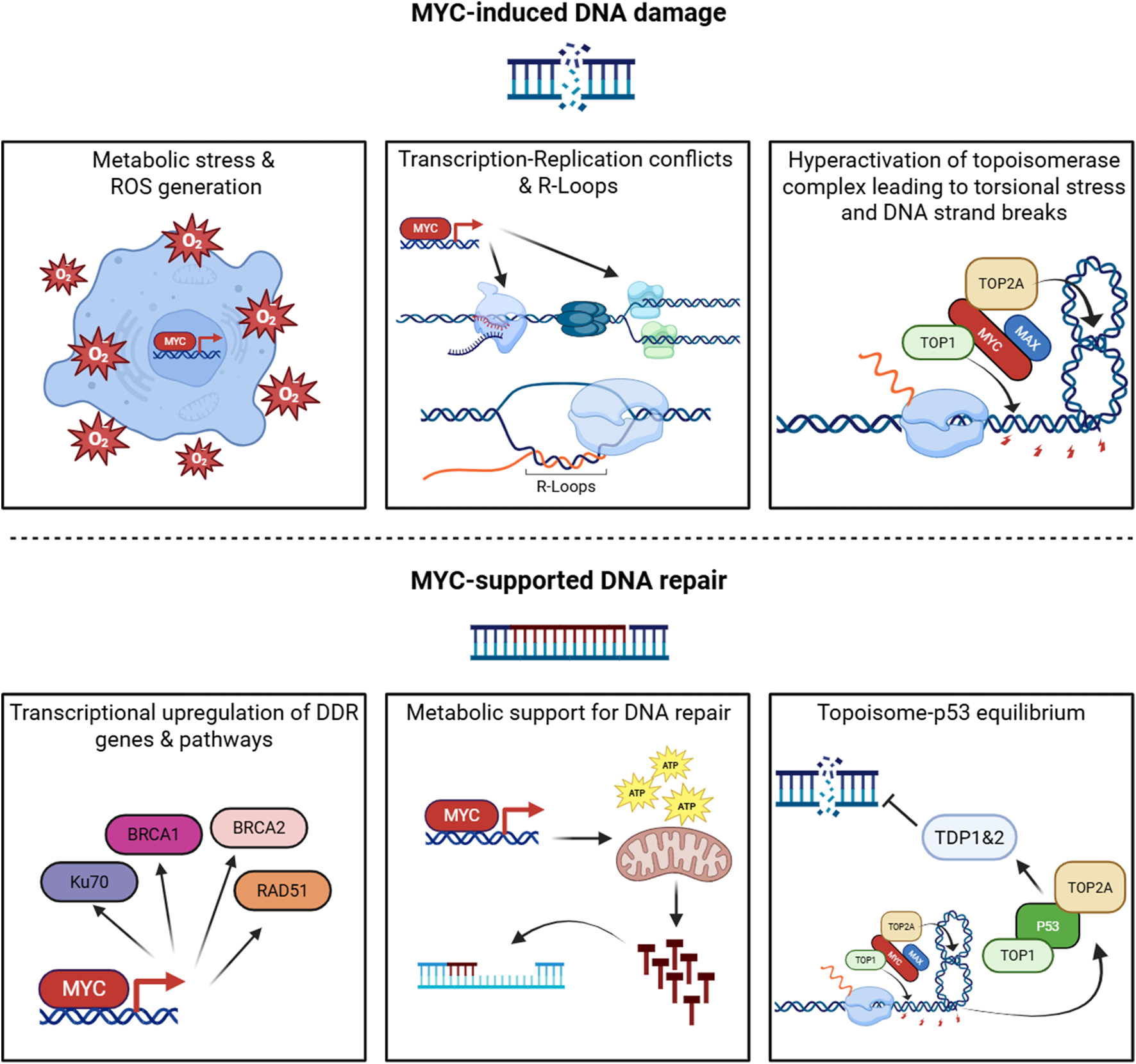 Figure 1. The dual role of MYC in the DNA damage response. MYC coordinates opposing functions that both generate and mitigate DNA damage. Upper panels (MYC-induced DNA damage): MYC drives metabolic and oxidative stress leading to ROS accumulation; promotes transcription- replication conflicts and R-loop formation; and enhances topoisomerase activity, Increasing torsional stress and DNA strand breaks. Lower panels (MYC-supported DNA repair): MYC upregulates key DNA damage response genes and pathways, provides metabolic support for nucleotide biosynthesis and repair, and modulates the topoisomerase p53 axis to maintain DNA repair equilibrium. “Topoisome” is used here to denote MYC-associated topoisomerase complexes (TOP1/TOP2) that regulate DNA topology during intense transcription. Created with BioRender.com.