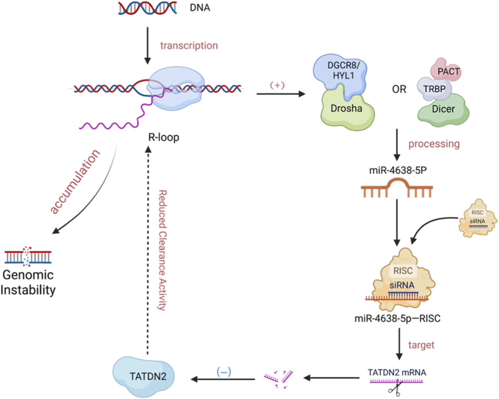 Bidirectional regulation of miRNA and R-loop. R-loops Facilitate miRNA Maturation. The formation of an R-loop (comprising an RNA-DNA hybrid and displaced single-stranded DNA) during transcription by RNA Polymerase II (RNAP II) promotes the co-transcriptional processing of primary miRNA (pri-miRNA) by the Drosha/Dicer complex, thereby enhancing the efficiency of mature miRNA production. miRNA Modulates R-loop Homeostasis. The mature miRNA, miR-4638-5p, binds to the 3′UTR of TATDN2 mRNA, inhibiting the expression of this R-loop-resolving enzyme. This suppression leads to the accumulation of unresolved R-loops, which subsequently contributes to genomic instability. (Created in BioRender. SY, W (2025) https://BioRender.com/8u9svd6).