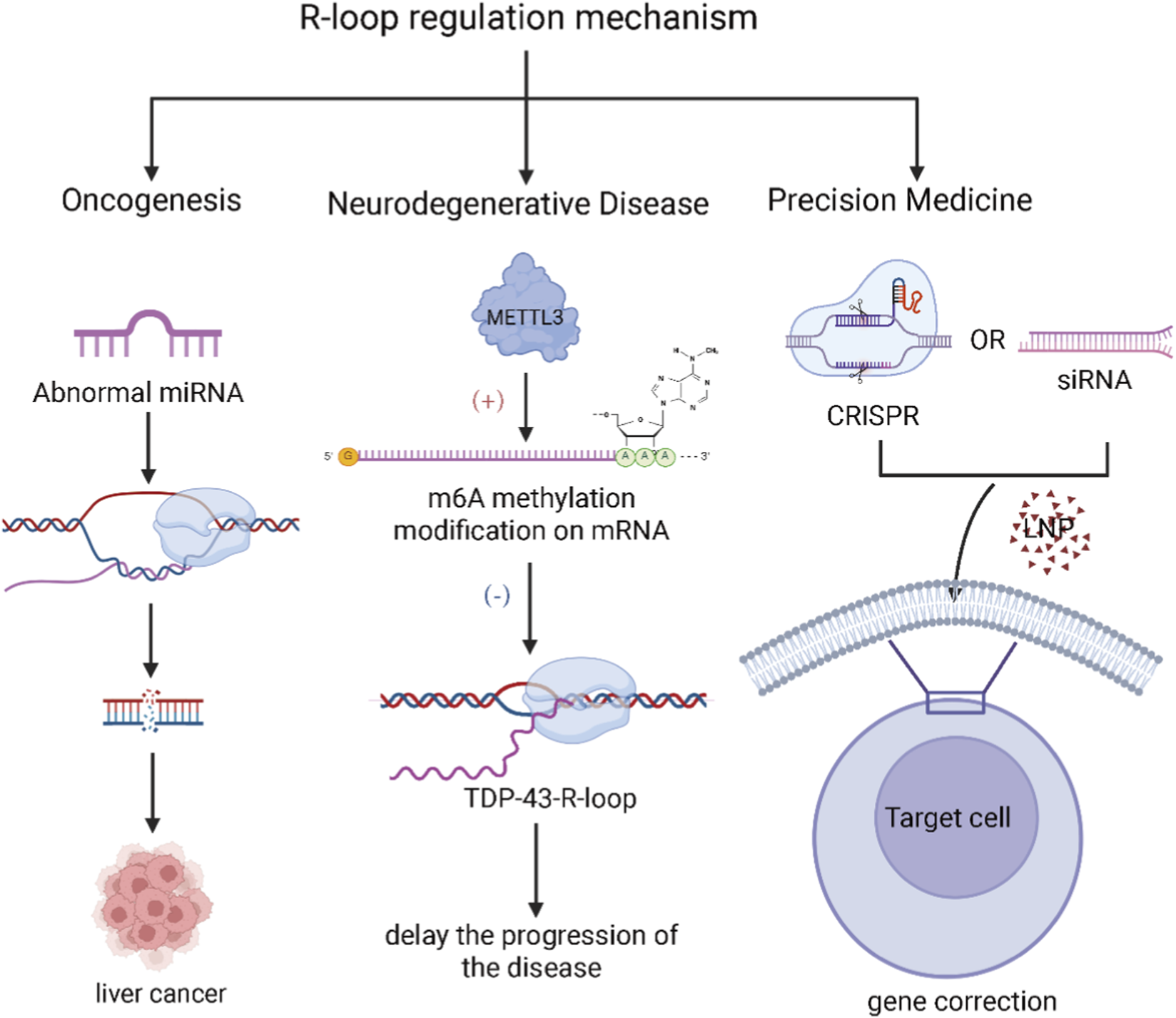 Proposed small RNA-based strategies targeting R-loop pathology (Left) Cancer: Dysregulated miRNA expression can influence R-loop levels, thereby promoting oncogenesis and tumor progression. (Center) Neurodegenerative Diseases: The accumulation of TDP-43-R-loops is a hallmark of certain neurodegenerative conditions. METTL3-mediated m6A modification has been shown to resolve these pathogenic R-loops, potentially delaying disease onset and progression. (Right) Gene Therapy: Emerging therapeutic strategies include the use of lipid nanoparticles (LNPs) to deliver small RNA-based therapeutics, as well as CRISPR-based gene editing systems designed to precisely correct R-loop-associated mutations in affected genes. (Created in BioRender. SY, W (2025) https://BioRender.com/u64e5wp).