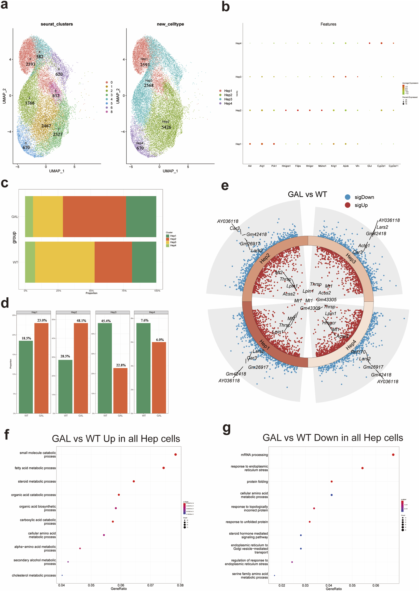 Cell types and their characteristic gene features in mice liver tissue. (a) UMAP scatter plot showing the uniform manifold approximation and projection of all cell types after annotation. (b) UMAP scatter plot of all 11 cell clusters after reclustering. (c) UMAP plots showing the expression of characteristic genes for each cell cluster. (d) Bar chart showing the proportion of each cell type in the GAL and WT groups (n = 2).(e) UMAP scatter plot of five annotated cell types. (f) Dot plot showing the expression of marker genes used for characterizing different cell types. (g) Bar chart showing the proportion of each cell type in the liver tissue of WT and GAL mice.