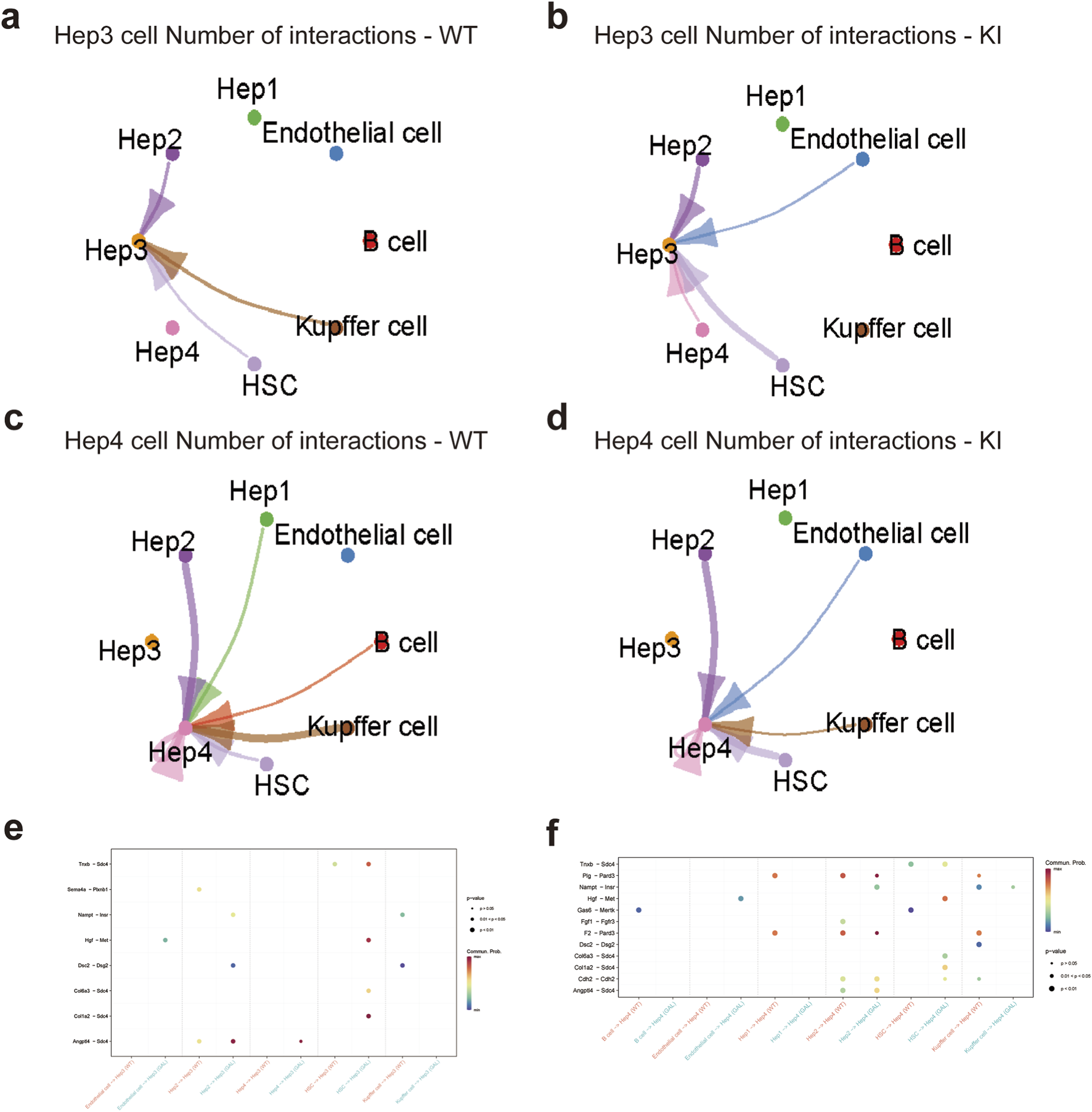 Effects of Galt gene editing on cell communication networks of Hep3 and Hep4 subtypes in mice liver tissue. (a) Ligand-receptor interaction network for Hep3 cells in the WT group. (b) Ligand-receptor interaction network for Hep3 cells in the GAL group. (c) Ligand-receptor interaction network for Hep4 cells in the WT group. (d) Ligand-receptor interaction network for Hep4 cells in the GAL group. (e) Dot plot of ligand-receptor pairs between Hep3 subtype and different cell types, indicating communication patterns in specific signaling pathways. (f) Dot plot of ligand-receptor pairs between Hep4 subtype and different cell types, indicating communication patterns in specific signaling pathways.