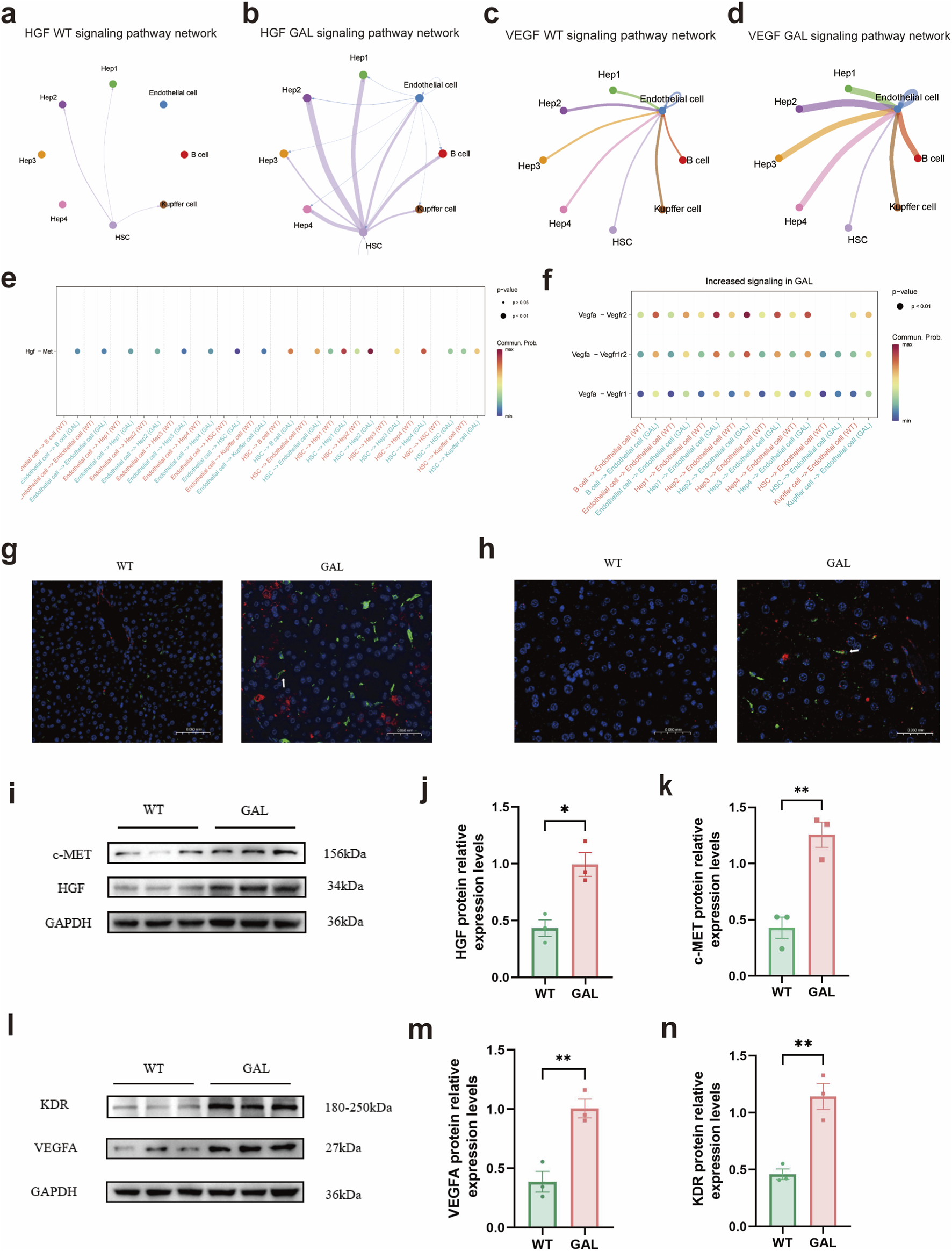 Effects of Galt gene editing on HGF and VEGF signaling pathways in mice liver tissue. (a) Cell-cell communication network of the HGF pathway in the GAL group. (b) Cell-cell communication network of the HGF pathway in the WT group. (c) Cell-cell communication network of the VEGF pathway in the GAL group. (d) Cell-cell communication network of the VEGF pathway in the WT group. (e) Dot plot of differential expression in cell-cell communication in the HGF pathway between GAL and WT groups. (f) Dot plot of differential expression in cell-cell communication in the VEGF pathway between GAL and WT groups. (g) Representative immunofluorescence (IF) images of liver tissues from WT and GAL mice showing the expression of HGF (red) and c-MET (green), with nuclei counterstained by DAPI (blue). (h) Representative immunofluorescence (IF) images of liver tissues from WT and GAL mice showing the expression of VEGFA (red) and KDR (green), with nuclei counterstained by DAPI (blue). (i) WB analysis of HGF and c-MET protein expression in WT and GAL liver tissues. (j,k) Statistical analysis of HGF and c-MET protein expression levels based on WB results. (For interpretation of the references to color in this figure legend, the reader is referred to the Web version of this article.) (l) WB analysis of VEGFA and KDR protein expression in WT and GAL liver tissues. (m,n) Statistical analysis of VEGFA and KDR protein expression levels based on WB results.