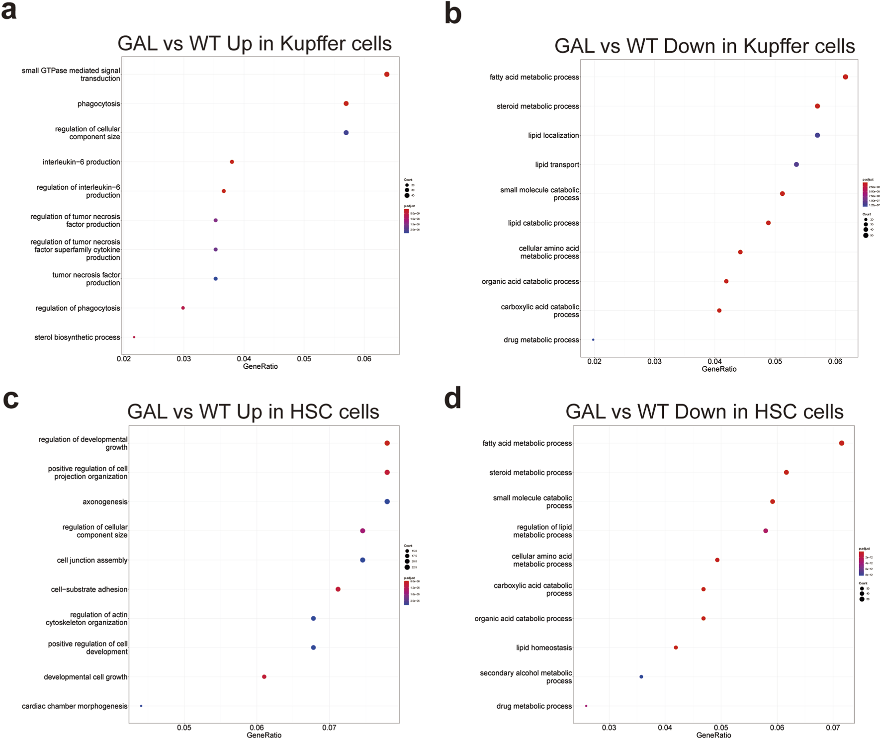 Effects of Galt gene editing on functional pathways in Kupffer cells and hepatic stellate cells. (a) GO enrichment analysis indicating upregulated inflammation-related pathways in Kupffer cells in the GAL group. (b) GO enrichment analysis indicating downregulated metabolism-related pathways in Kupffer cells in the GAL group. (c) GO enrichment analysis showing upregulated inflammation-related pathways in hepatic stellate cells in the GAL group. (d) GO enrichment analysis showing downregulated metabolism-related pathways in hepatic stellate cells in the GAL group.