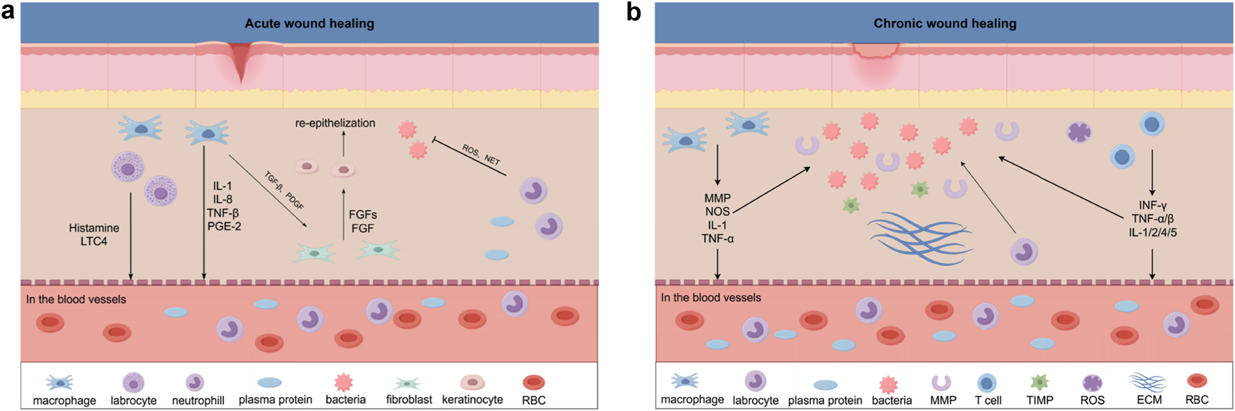 (a) Acute Wound Healing In acute wound healing, local immune responses promote inflammation and re-epithelialization through the release of cytokines such as IL-1, IL-8, TNF-β, and PGE-2. Factors like Histamine and LTC4 further enhance the local immune response, while TGF-β and FGF play essential roles in re-epithelialization. Neutrophils and macrophages in the blood vessels are recruited to the wound site, aiding in the clearance of bacteria and dead cells. (b) Chronic Wound Healing In chronic wound healing, persistent inflammation impedes the normal healing process, with factors such as MMP, NOS, IL-1, and TNF-α maintaining prolonged local inflammation. Unlike acute wounds, angiogenesis is impaired in chronic wounds. INF-γ, TNF-α/β, and IL-1/2/4/5 are released, modulating immune responses and influencing various stages of wound healing. MSCs play a critical role in this process through immune modulation, promoting angiogenesis, and paracrine effects, offering potential therapeutic approaches.