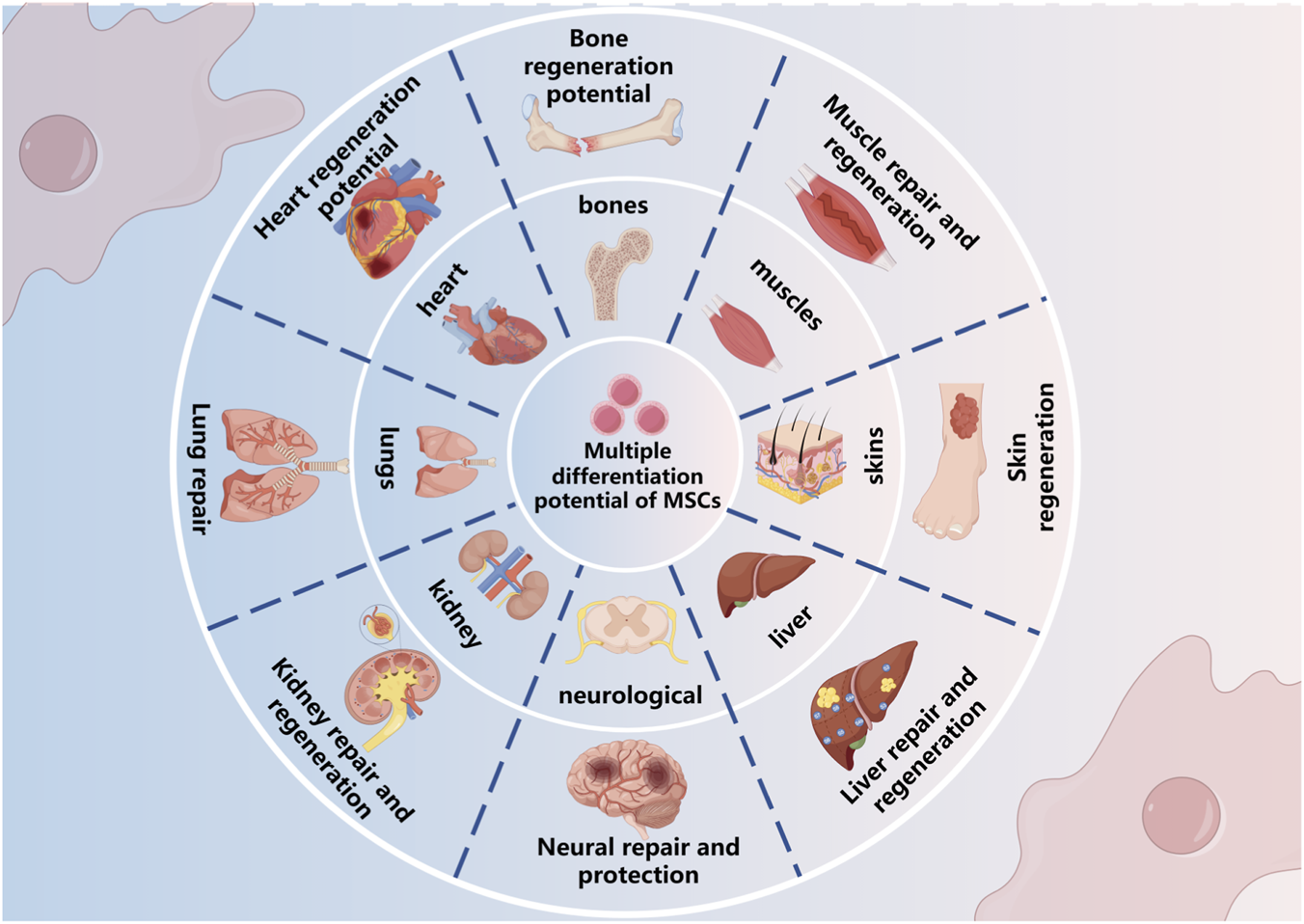 Multiple differentiation potential of mesenchymal stem cells (MSCs). MSCs possess the capacity to differentiate into various tissue types, including bone, muscle, skin, liver, kidney, lung, heart, and nervous system, contributing to tissue repair and regeneration across multiple organ systems.