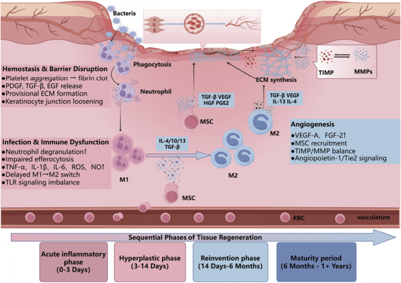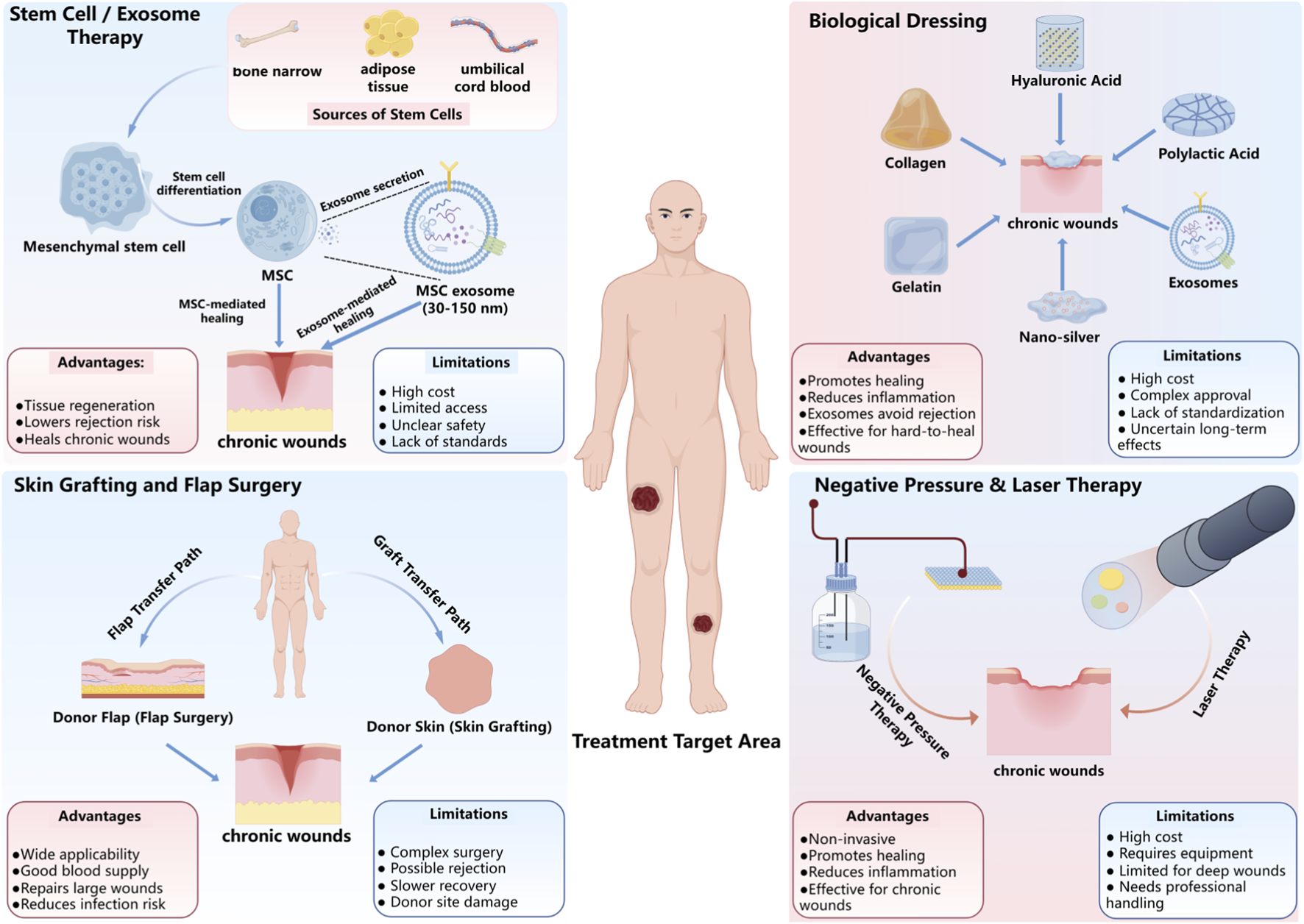 While MSCs could change into fibroblasts, keratinocytes, or endothelial-like cells, the chance of stable long-term integration and functional differentiation occurring in chronic microenvironments is not high, and clinicians rely on more on paracrine and immunomodulatory effects (e.g., angiogenesis, anti-inflammation and epithelialization) (Zhu et al., 2023; Gao et al., 2024);