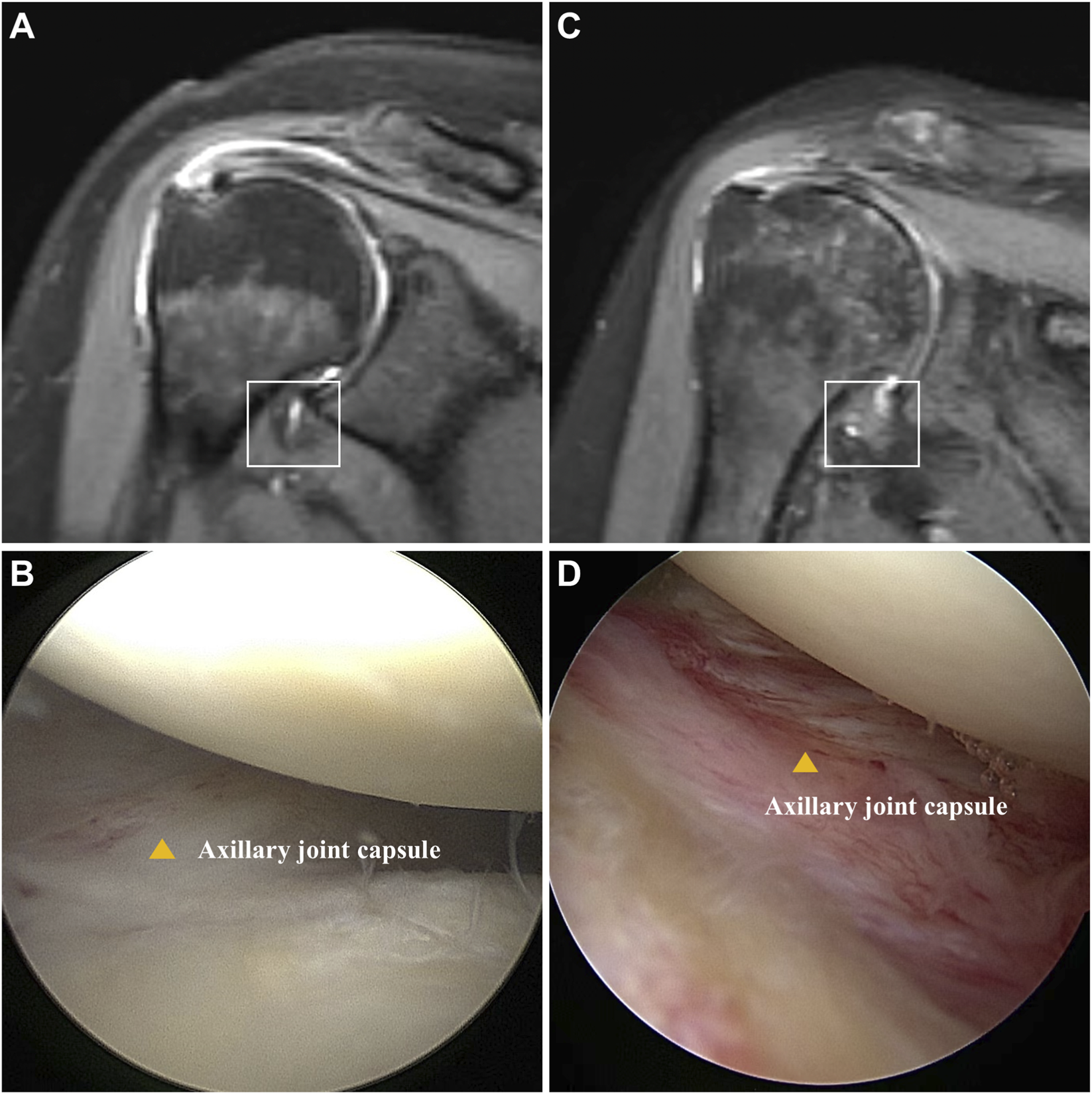 Figure 1. Comparison of patients with and without SS. (A) Oblique coronal fat-suppressed T2-weighted MRI shows no thickening or edema of the humeral joint capsule in the axillary recess (square). (B) Arthroscopy revealed no hyperplasia or redness and swelling in the axillary joint capsule (yellow triangle). (C) Oblique coronal fat-suppressed T2-weighted MR image showed thickening and edema of joint of axillary recess (square). (D) Arthroscopy revealed hyperplasia and redness of the axillary capsule of the shoulder joint (yellow triangle).
