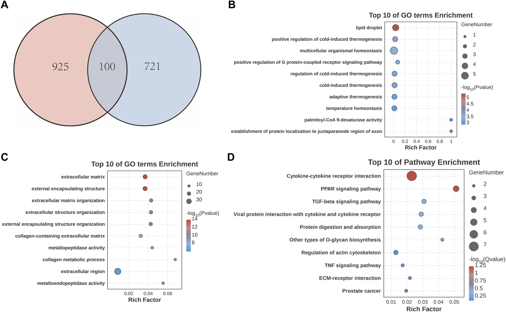 Figure 3. Identification and analysis of common DEGs in SS and AC. (A) Venn diagram showing the overlap of DEGs between SS and AC. (B) GO enrichment analysis of upregulated common DEGs. (C) GO enrichment analysis of downregulated common DEGs. (D) KEGG pathway enrichment analysis of the common DEGs.