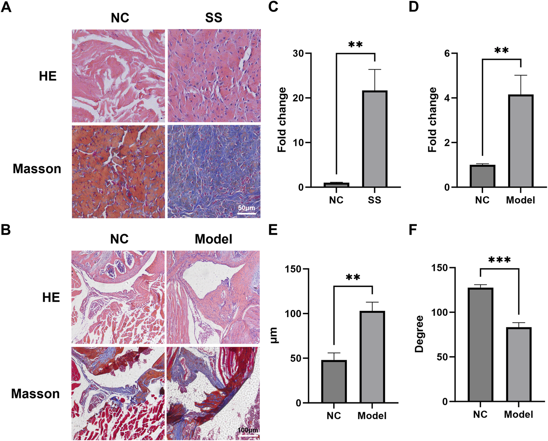 Figure 5. The joint capsules of SS patients and SS mice exhibited significant fibrosis. (A,B) Representative HE and Masson images of the capsules of SS patients and SS mice. (C) Quantification of collagen deposition in the patient capsules. (D) Quantification of cell infiltration in the mouse capsules. (E) Average thickness of the mouse capsules. (F) Passive ROM of mouse shoulder joint. **p < 0.01, ***p < 0.001.
