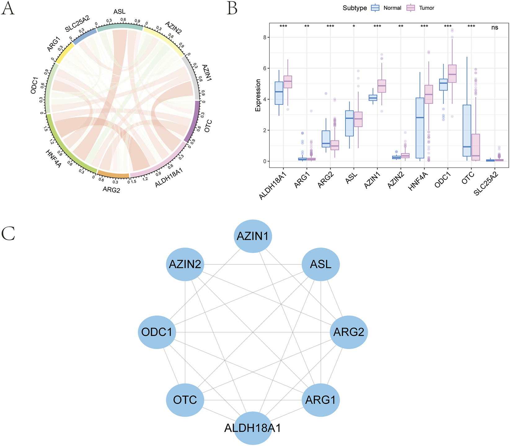 Ten ArMGs were initially retrieved from the GSEA database (https://www.gsea-msigdb.org/gsea/msigdb). A co-expression network was then constructed using gene expression profiles from GC tissues and visualized as a correlation circle plot (Figure 1A). Differential expression analysis between normal and GC tissues revealed significant dysregulation in nine genes: AZIN2, HNF4A, ARG1, ARG2, ASL, ODC1, OTC, AZIN1, and ALDH18A1 (Figure 1B). Finally, a protein-protein interaction (PPI) network for these nine differentially expressed genes was generated using the STRING database (https://string-db.org) and visualized in Cytoscape (Figure 1C).