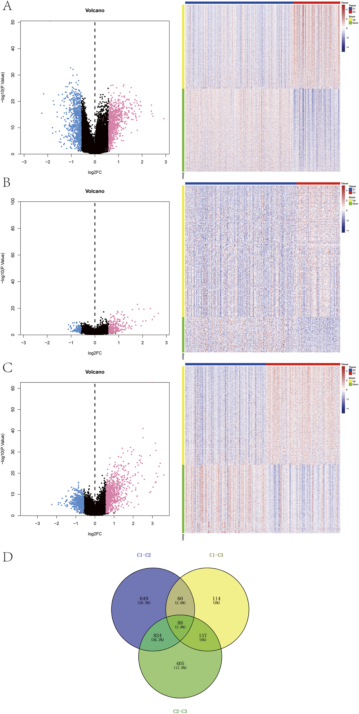 Identification of subtype-specific genes. (A–C) Volcano plots and heatmaps showing differentially expressed genes (DEGs) among the three subtypes. (D) Venn diagram of DEGs across subtypes.