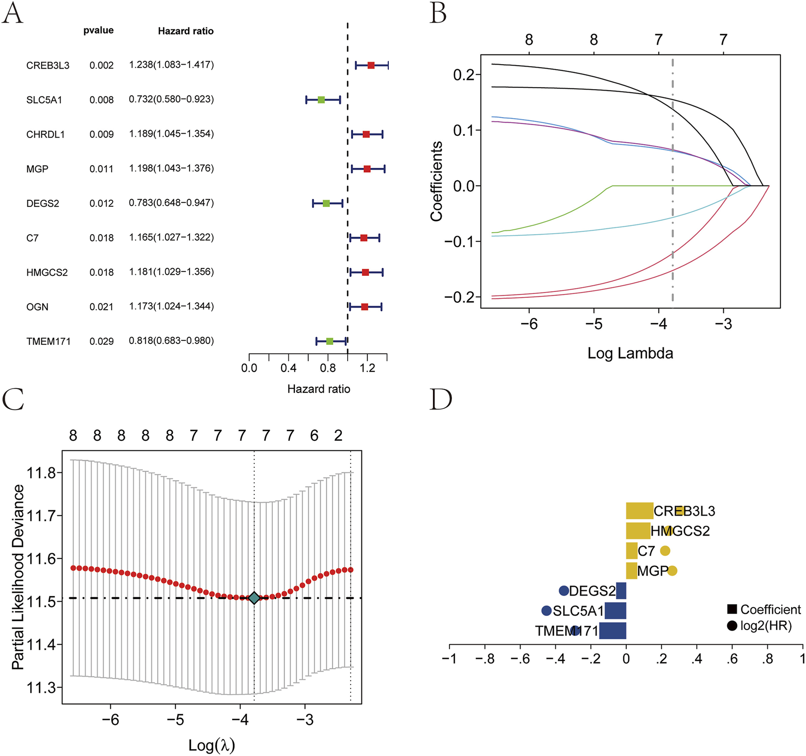 Establishment of the prognostic model. (A) Nine prognostic genes identified by univariate Cox regression. (B–D) Construction of the prognostic model using Lasso regression.