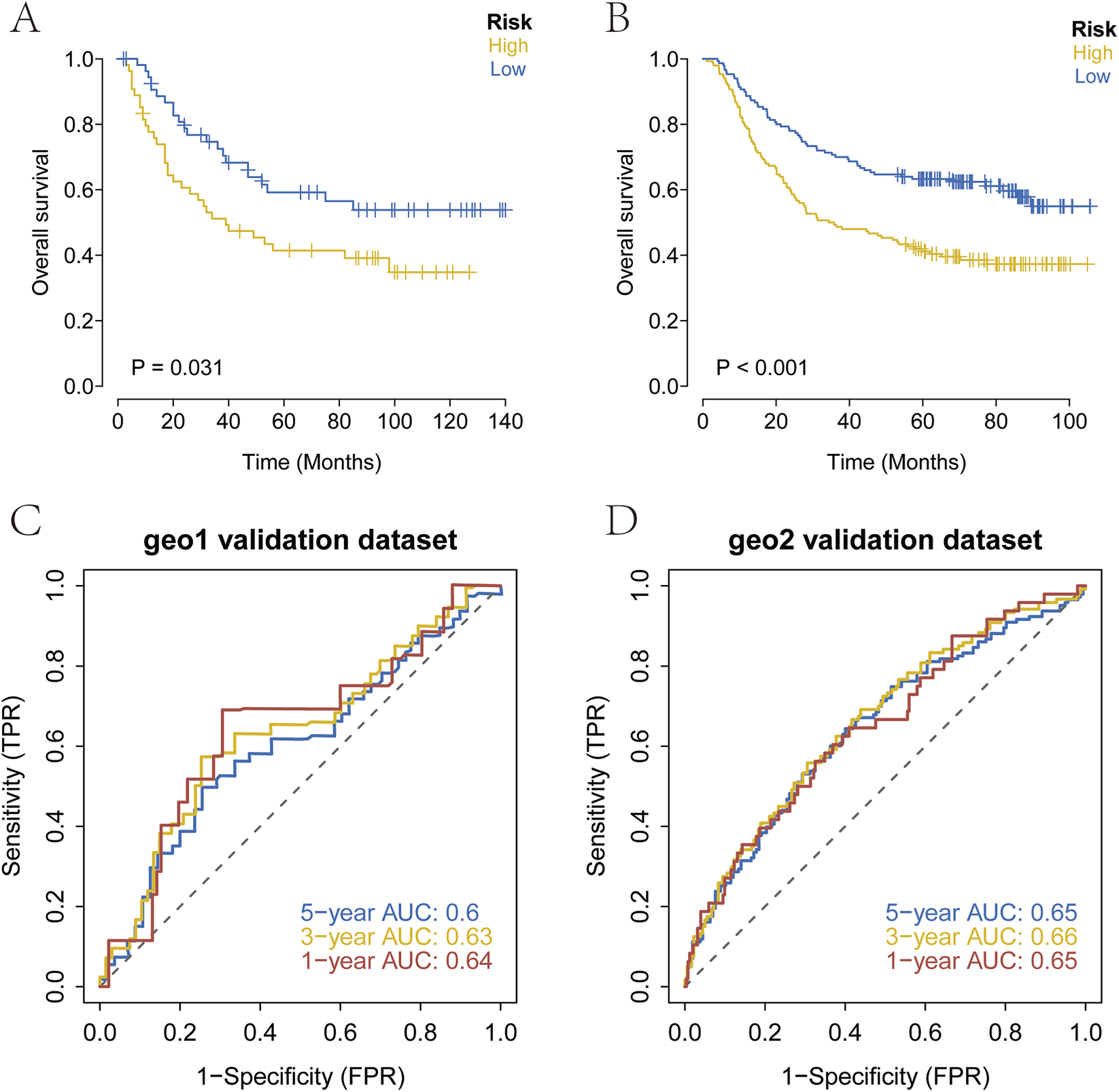 External validation of the prognostic model. (A–D) Kaplan-Meier survival curves and ROC curves in the GEO cohort. High-risk patients showed significantly poorer OS, and the ROC analysis confirmed strong predictive performance.