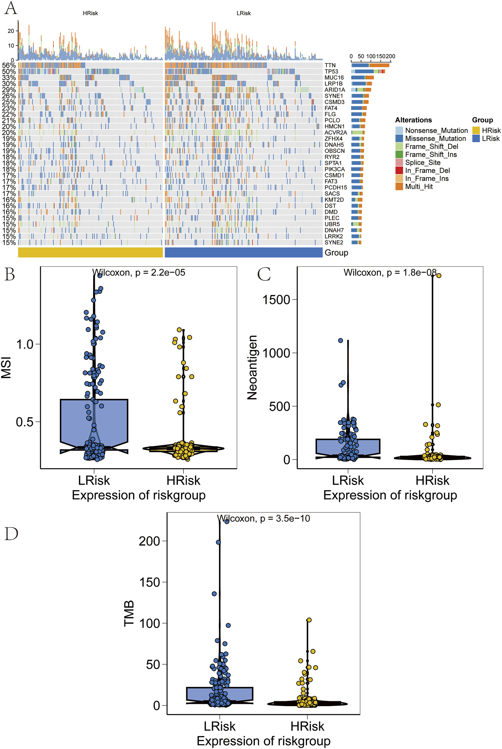 Validation of performance across risk groups. (A) Heatmap of somatic mutation spectra in high and low-risk groups, with percentage indicating mutation frequency. (B–D) Comparison of microsatellite instability (MSI), neoantigen (NEO) load, and tumor mutational burden (TMB) between risk groups.
