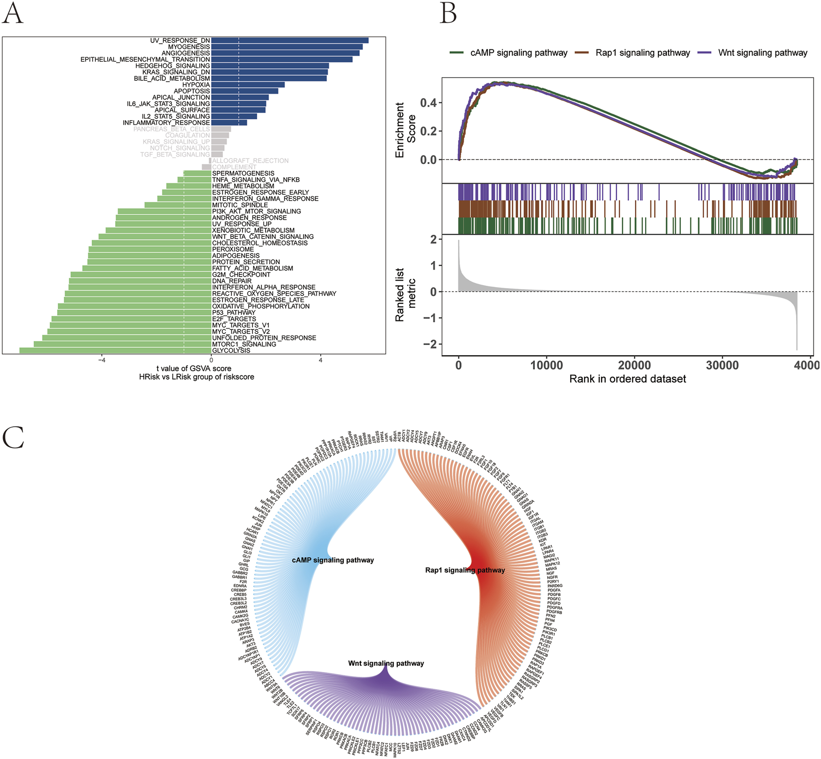 Functional pathway analysis of risk groups. (A) GSVA. (B) GSEA. (C) Molecular interaction network of enriched signaling pathways.