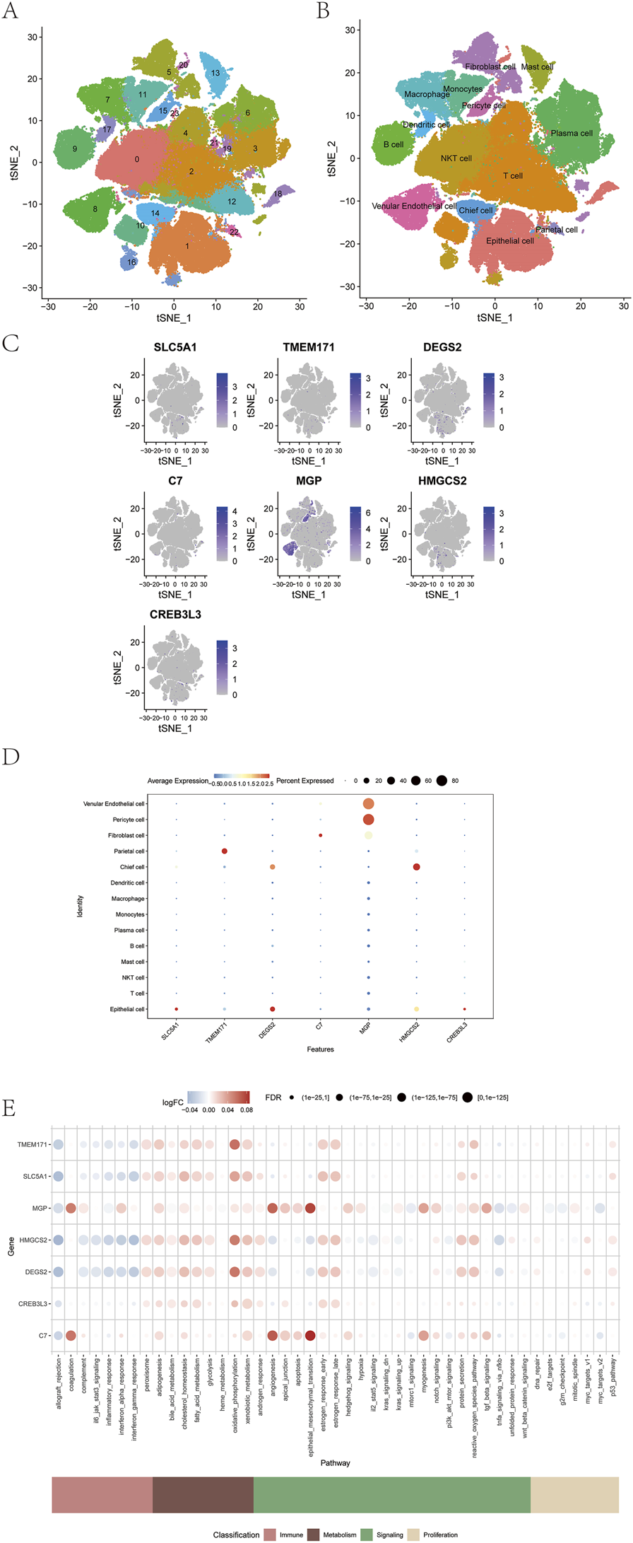 Single-cell transcriptomic analysis was performed using the t-SNE algorithm, resulting in the identification of 24 distinct cellular subtypes (Figure 11A). These subtypes were annotated into 14 major cell lineages: venular endothelial cells, pericytes, fibroblasts, parietal cells, chief cells, dendritic cells, macrophages, monocytes, plasma cells, B cells, mast cells, NKT cells, T cells, and epithelial cells (Figure 11B). The expression patterns of the seven prognostic model genes were visualized across all annotated lineages (Figures 11C,D). In addition, the AUCell function was used to perform quantitative analysis of immune-related and metabolic pathways at the single-cell level, demonstrating correlations between model gene expression and specific immune and metabolic signaling pathways (Figure 11E).