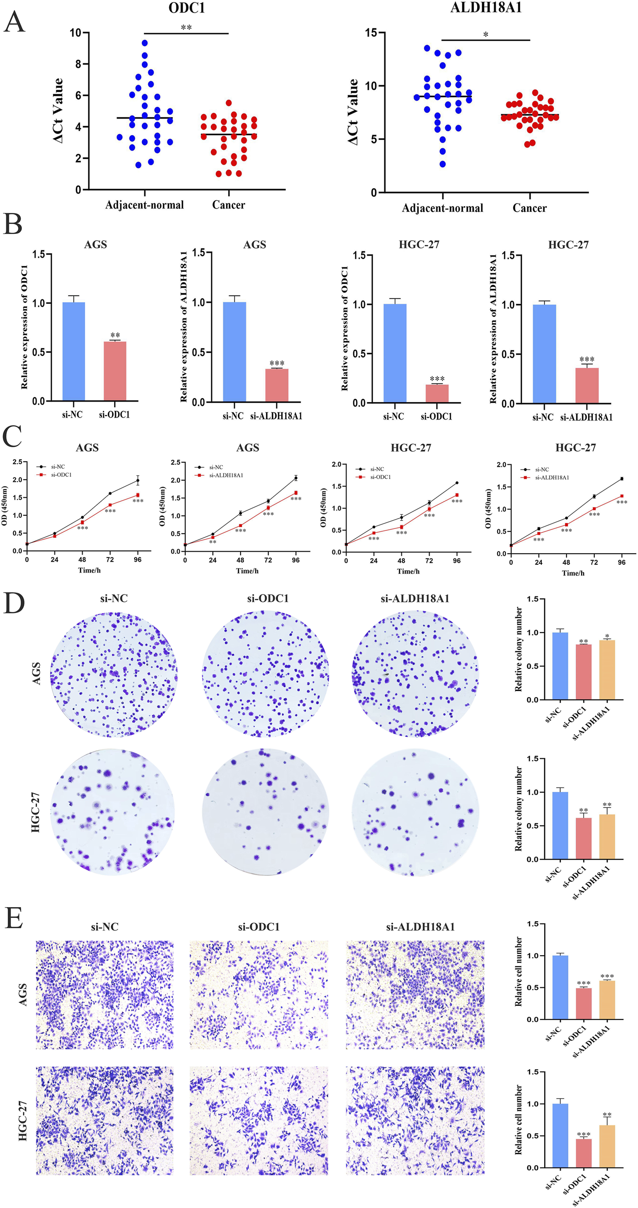 Validation of ODC1 and ALDH18A1 expression and clinical relevance in GC was performed using cell lines and clinical tissue specimens. qPCR analysis revealed that both genes were significantly upregulated in GC tissues compared with adjacent normal tissues (Figure 12A). Two GC cell lines (AGS and HGC-27), which showed significant differential expression of the target genes relative to the normal gastric epithelial cell line GES-1, were selected for subsequent functional assays. To explore the biological roles of ODC1 and ALDH18A1 in GC progression, siRNAs targeting each gene were transfected into AGS and HGC-27 cells. The knockdown efficiency was confirmed by PCR (Figure 12B). The functional consequences of gene silencing were evaluated using cell proliferation, colony formation, and transwell invasion assays. Experimental results demonstrated that knockdown of ODC1 and ALDH18A1 significantly inhibited GC cell proliferation (Figure 12C), colony formation (Figure 12D), and invasive capacity (Figure 12E).